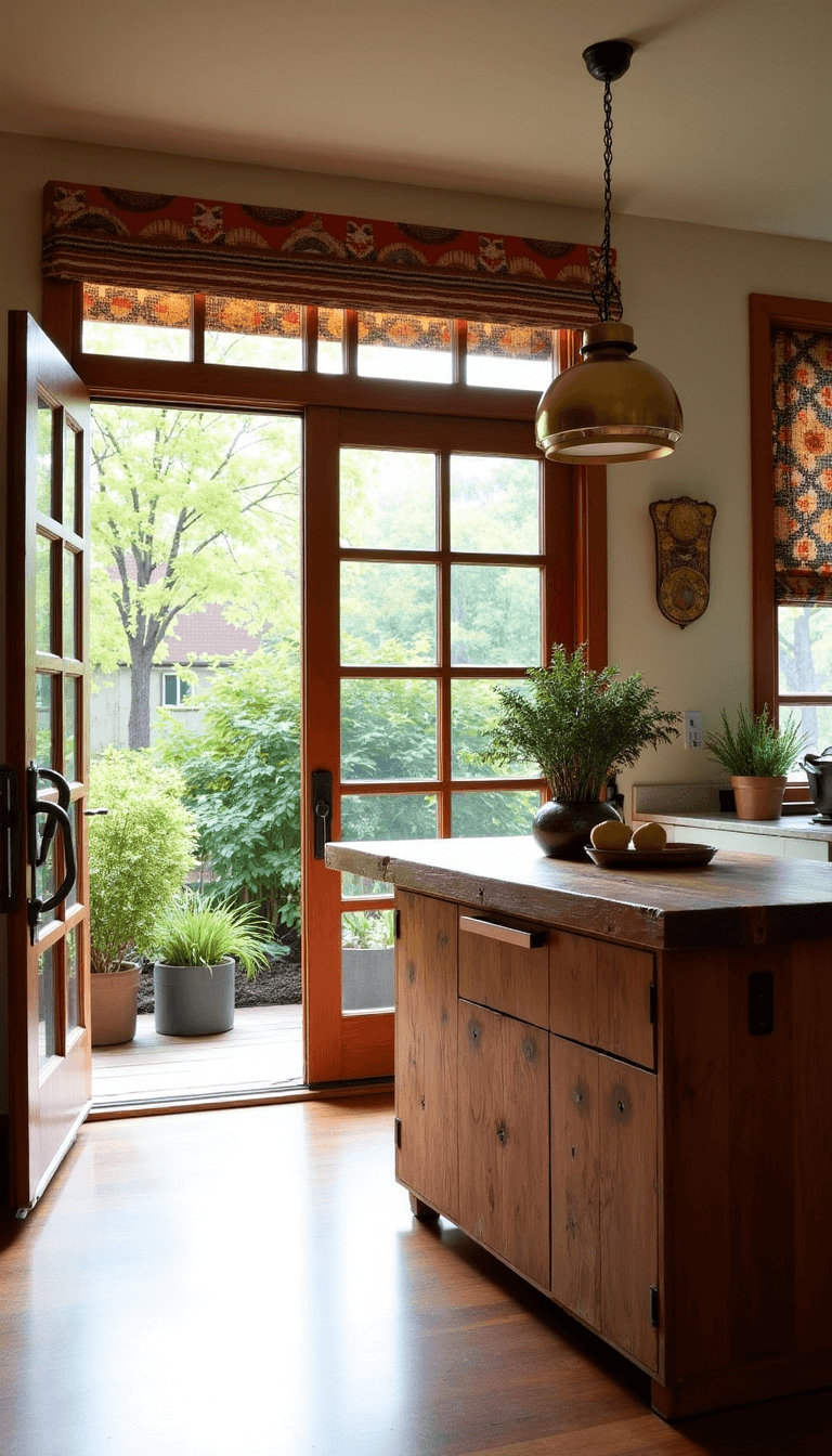 "Sunlit modern kitchen with African-inspired murals, wooden island, brass pendant lights, Moroccan tiles, vintage cookware, potted succulents, and high-end appliances"