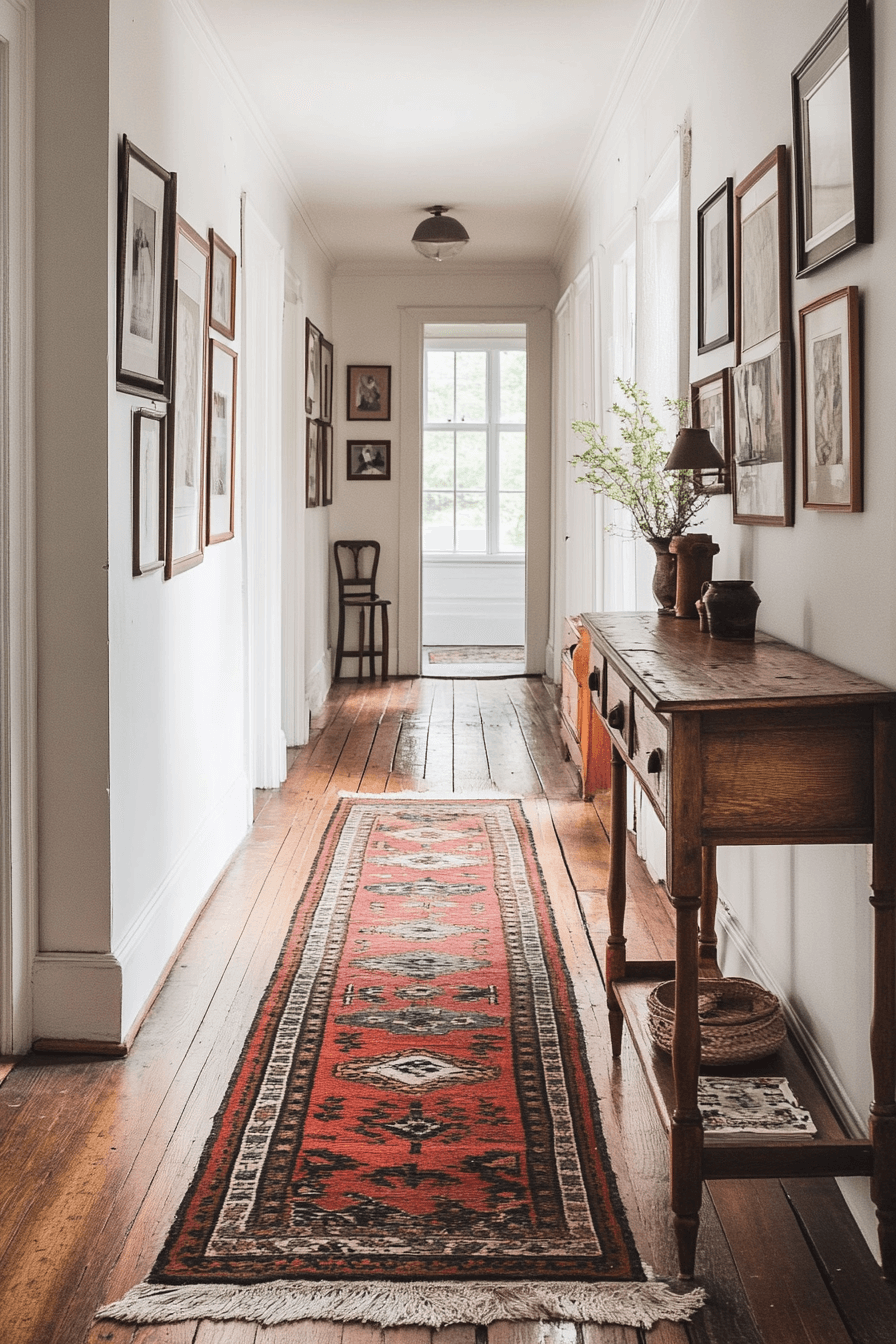 Heritage-style hallway runners are classic antique farmhouse decor ideas that bring texture and nostalgia to every step. Their faded patterns and muted tones create a cozy, comforting atmosphere underfoot. These runners complement rustic floors while adding charm to high-traffic areas. Each one tells a story of days gone by, transforming hallways into beautiful paths filled with character.