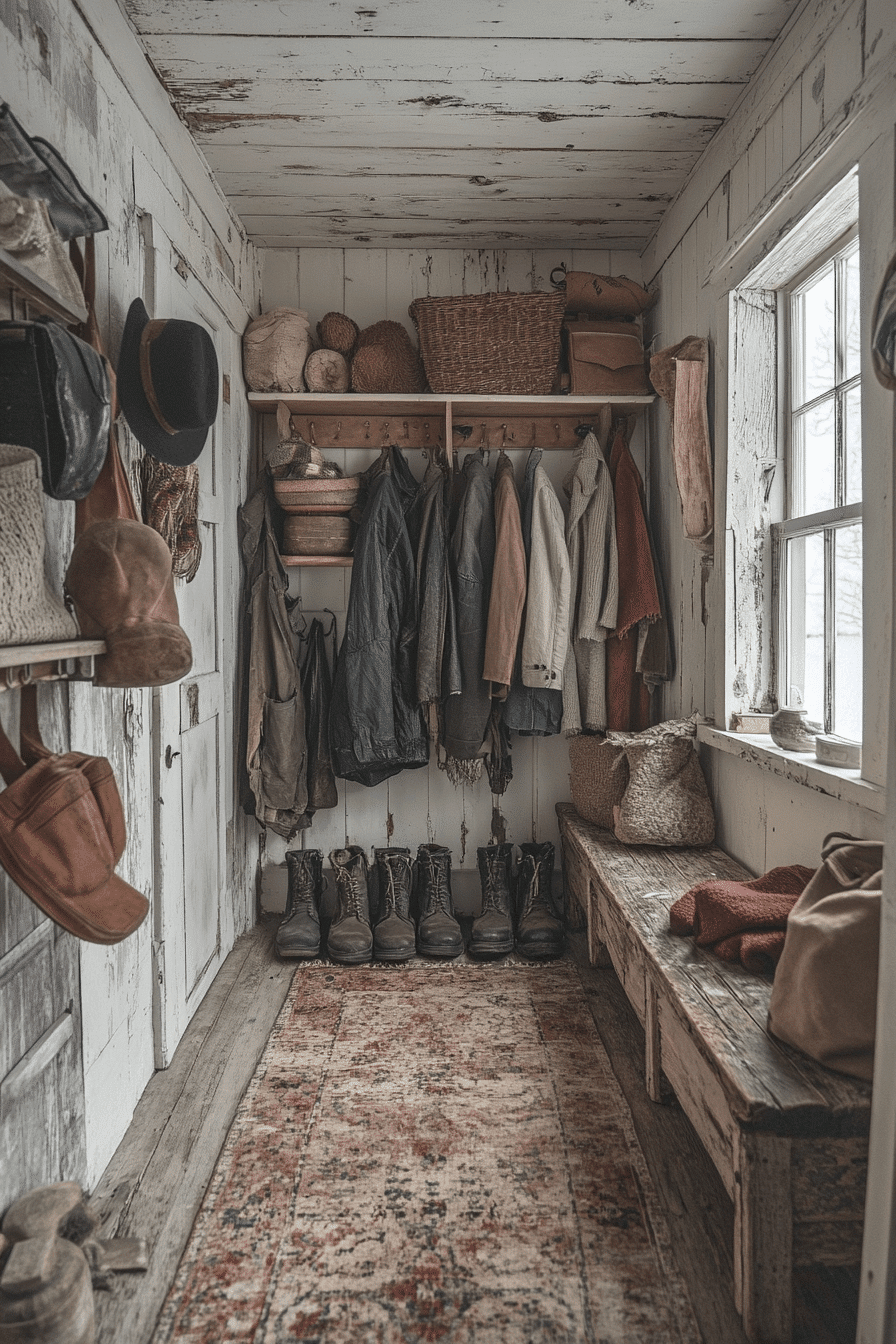 A thoughtfully designed boot room is one of the most functional and stylish antique farmhouse decor ideas for your entryway. Rustic benches, vintage hooks, and woven baskets offer both character and practicality. The timeworn materials stand up to daily use while adding warmth and charm to your space. This blend of organization and nostalgia creates a welcoming environment.