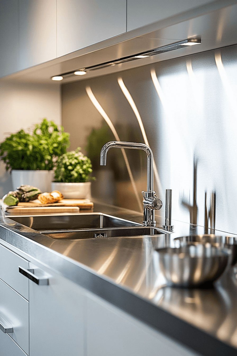 Contemporary flair strengthens backsplash kitchen ideas that incorporate metallic materials into the design. Reflective surfaces add dimension while enhancing brightness. These finishes complement sleek appliances and minimalist layouts beautifully. Durability and stain resistance increase functionality. The kitchen feels modern and polished.