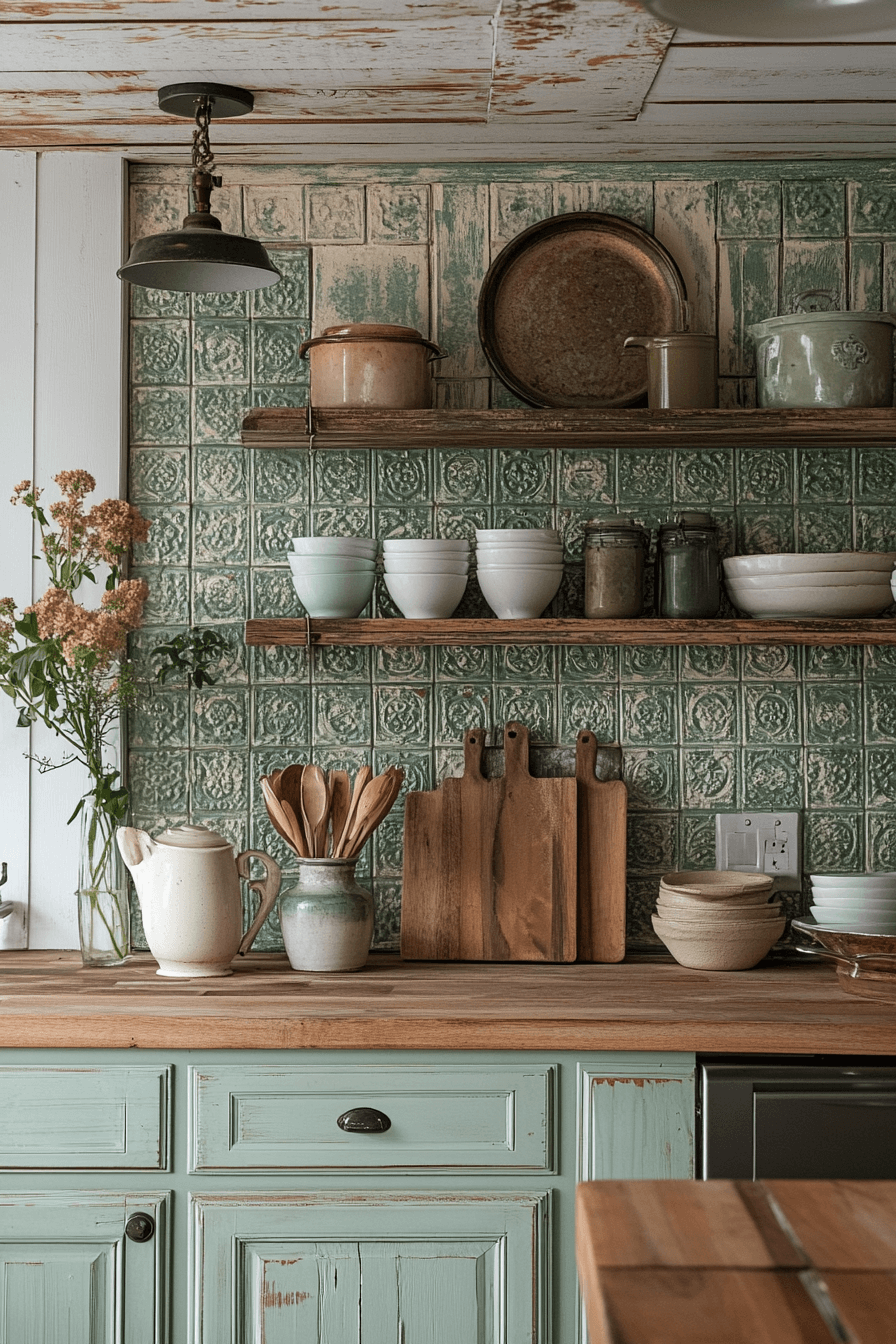 Decorative detail enhances backsplash kitchen ideas that feature vintage tin tiles with embossed texture. Intricate patterns add depth without overwhelming the wall. Lightweight construction simplifies installation. Painted or raw finishes allow creative freedom. The kitchen gains nostalgic character.