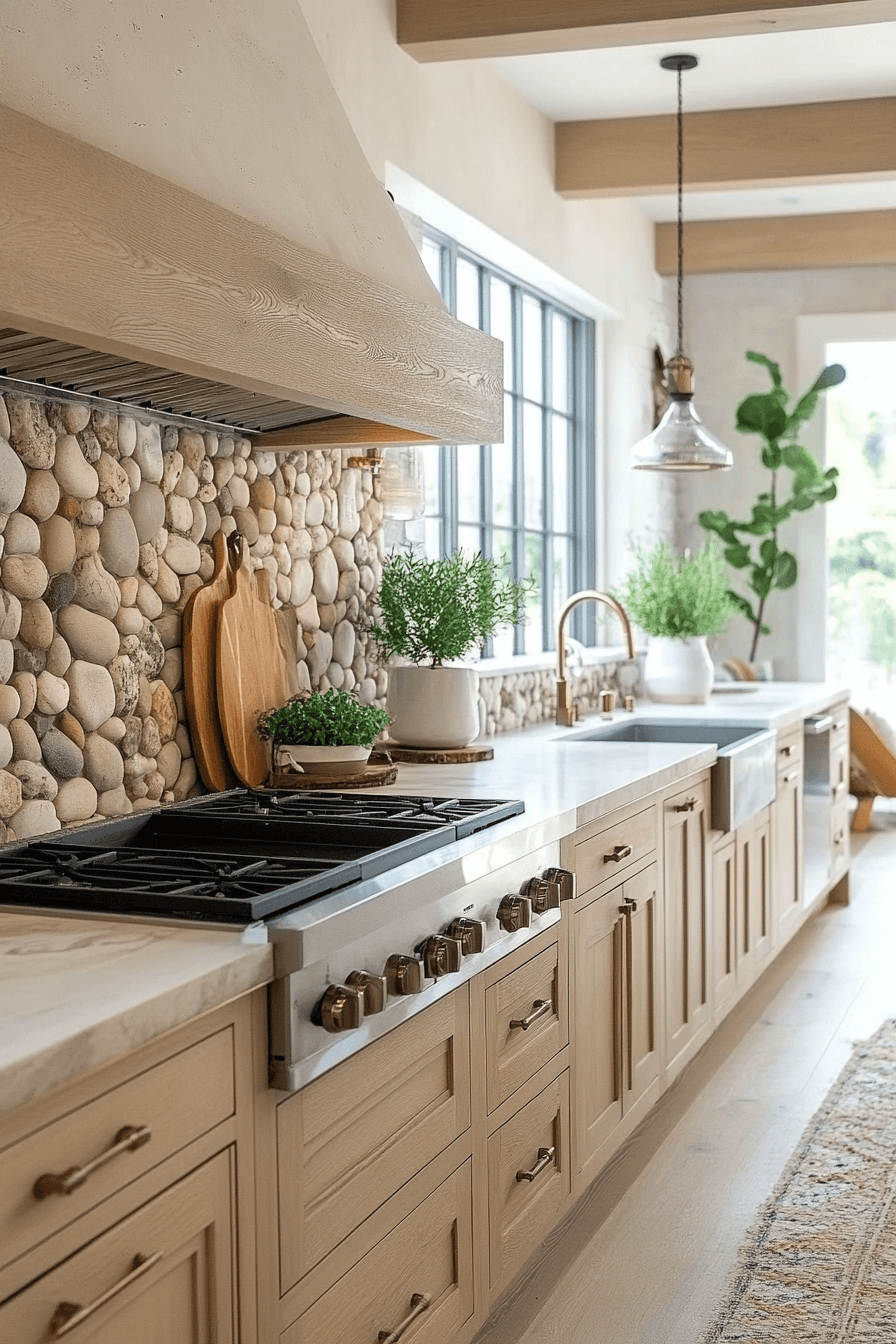 Flowing texture defines backsplash kitchen ideas that use pebble stone tiles for organic movement. Rounded shapes soften the wall and add tactile interest. This style complements coastal and spa-inspired kitchens beautifully. Sealed finishes support durability. The atmosphere feels calming and natural.