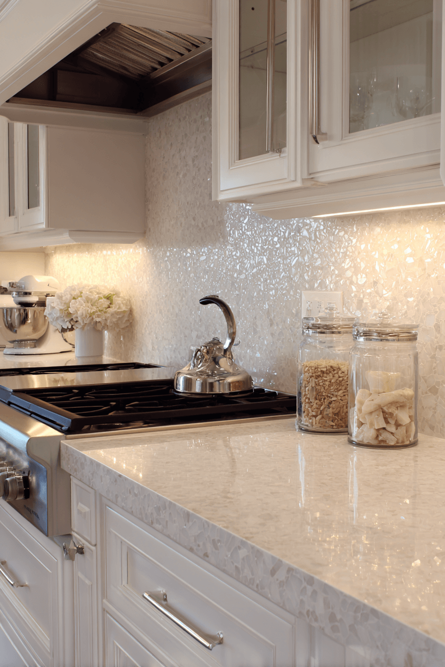 Low-maintenance luxury defines backsplash kitchen ideas built around quartz surfaces. Non-porous construction resists stains and moisture. Seamless installations create a clean, modern look. Quartz mimics natural stone without extensive upkeep. The kitchen feels refined and practical.