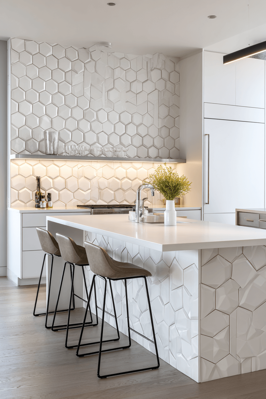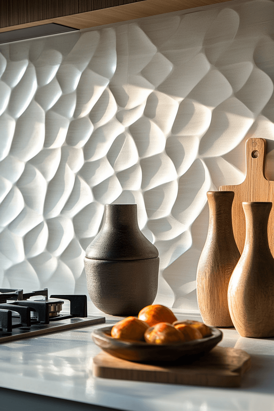 Bold dimension defines backsplash kitchen ideas that rely on three-dimensional tile designs. Textured surfaces interact with light to create depth. These tiles add impact without clutter. They work especially well in modern kitchens. The design feels sculptural and immersive.