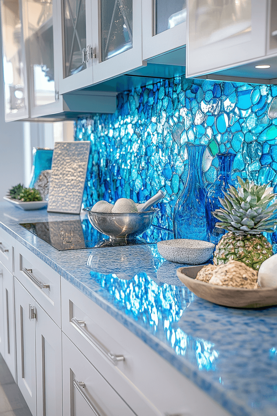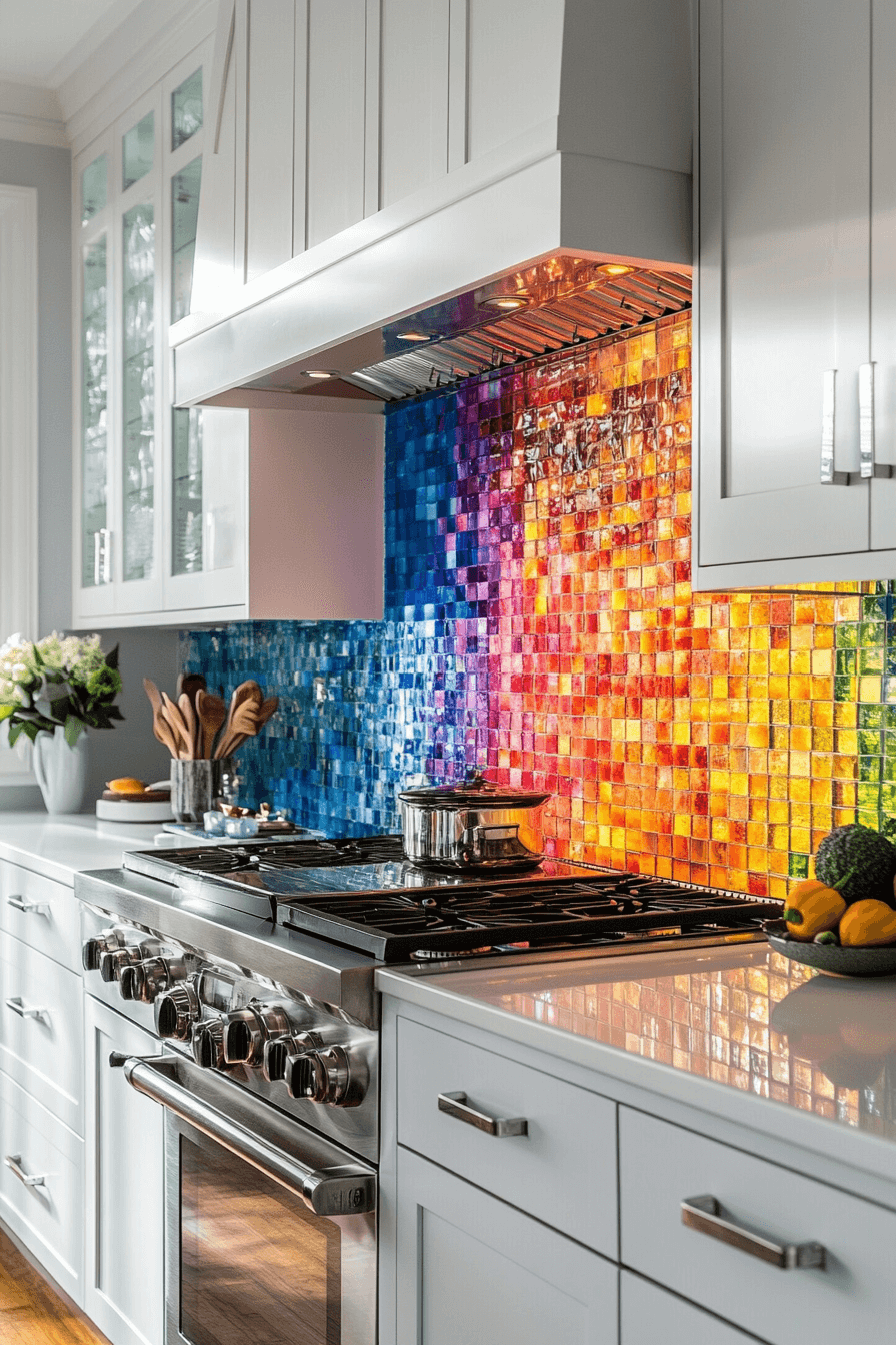 Radiant vibrancy energizes backsplash kitchen ideas featuring colorful glass tile designs. Reflective surfaces enhance brightness and depth. Bold hues add personality without sacrificing polish. Maintenance remains simple despite vivid color. The kitchen feels joyful.