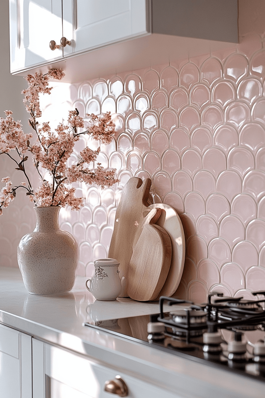 Graceful curves soften backsplash kitchen ideas that incorporate scalloped tile designs. The flowing pattern adds elegance and movement. These tiles suit coastal, cottage, and vintage kitchens. The wall becomes an artistic focal point. The result feels charming and refined.