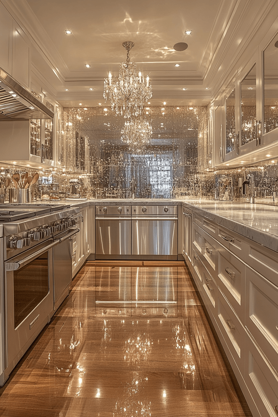 Light-enhancing beauty defines backsplash kitchen ideas that incorporate mirrored tiles into the design. Reflective surfaces expand the visual space and increase brightness. These tiles add glamour without overwhelming the room. Cleaning remains simple despite the polished appearance. The kitchen feels sleek and open.