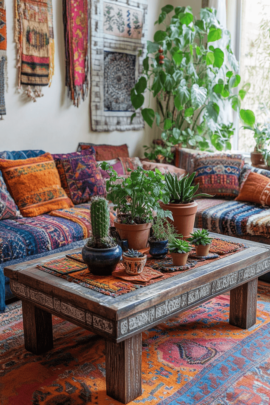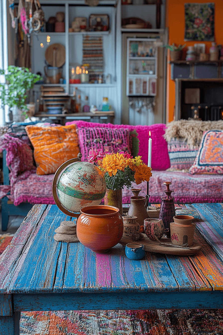 Texture and soul define coffee table decor ideas rooted in bohemian style. Woven details, handmade ceramics, and layered objects create depth and warmth. Personal items spark curiosity and conversation. The look feels relaxed and artistic. Creativity flows freely.