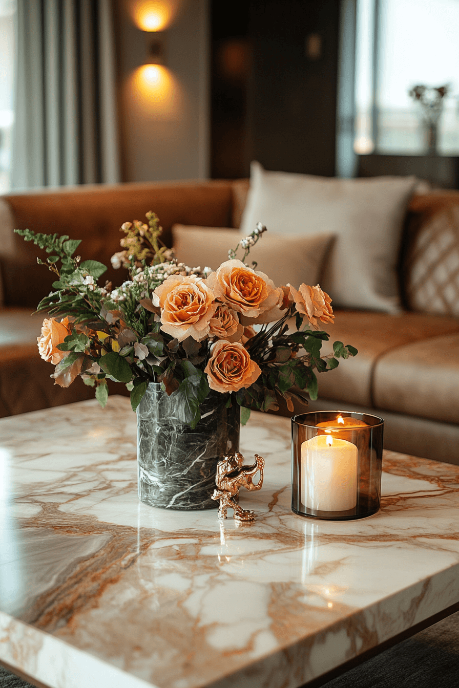 Natural elegance shines through coffee table decor ideas featuring marble accents. Smooth stone surfaces add texture and timeless appeal. Warm metals or wood soften the look. The table feels elevated yet balanced. Marble brings quiet luxury.