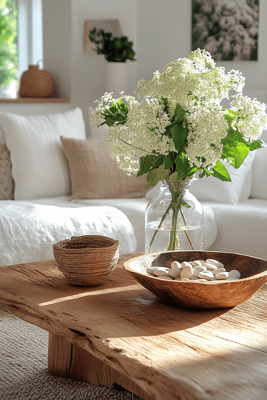 Organic textures and earthy tones define coffee table decor ideas inspired by nature. Natural materials and greenery bring balance and calm indoors. Each piece feels grounded and authentic. The table connects the room to the outdoors. Beauty feels effortless.