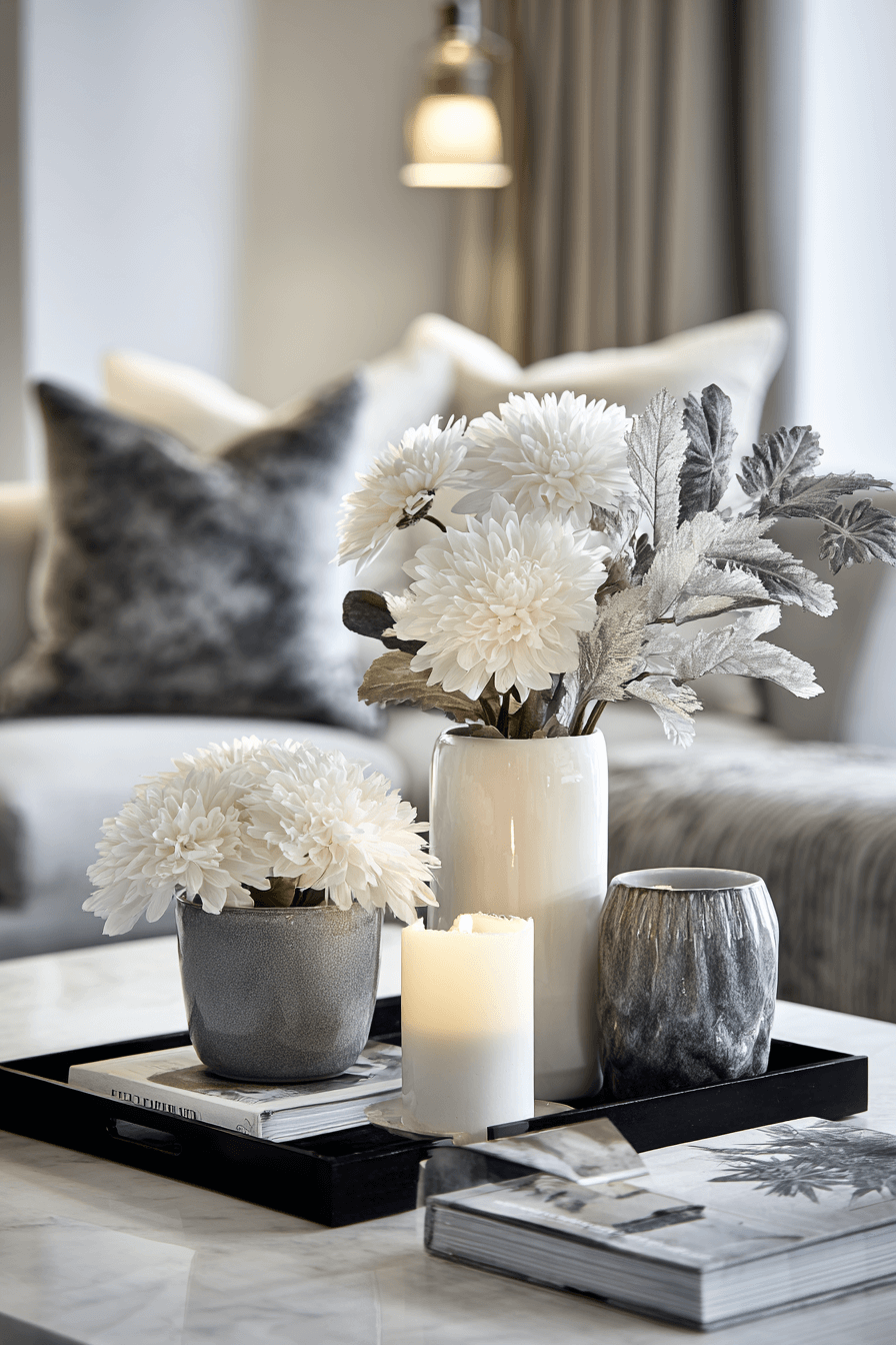 Bold simplicity defines coffee table decor ideas built around monochrome palettes. Varying textures add depth while keeping the color story cohesive. The look feels modern and striking. Visual interest stays clean and intentional. The table feels designer-worthy.