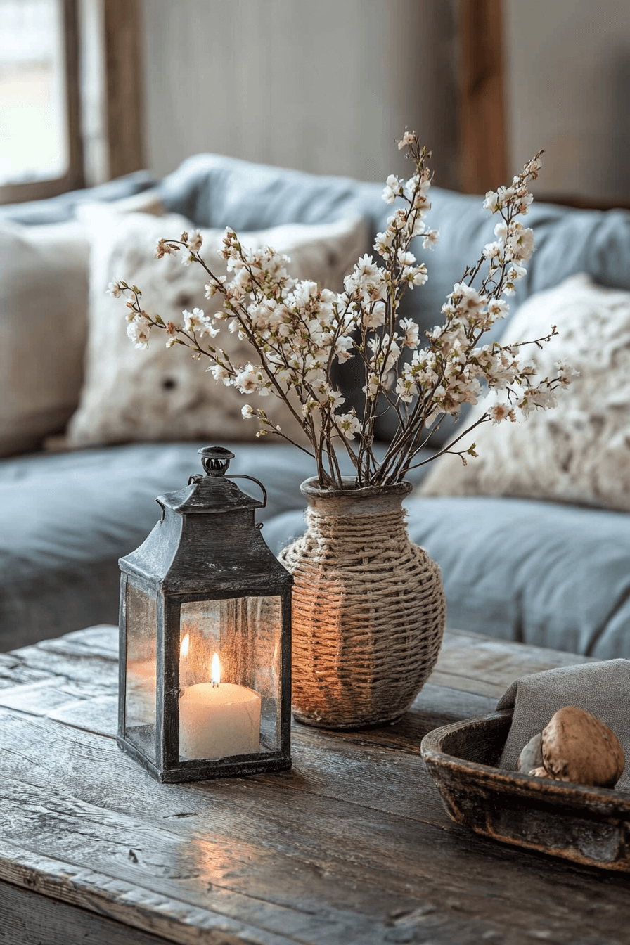 Warmth and character come together with coffee table decor ideas inspired by rustic comfort. Natural wood trays, soft textiles, and gently worn books create an inviting foundation. Organic elements such as dried stems or greenery soften the arrangement. Every detail feels welcoming and familiar. The space feels relaxed yet thoughtfully styled.
