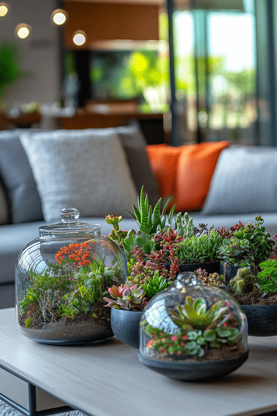 Living greenery takes center stage with terrarium coffee table decor ideas. Glass vessels filled with plants add freshness and texture. The look feels calming and modern. Maintenance stays minimal. Nature becomes part of the decor.