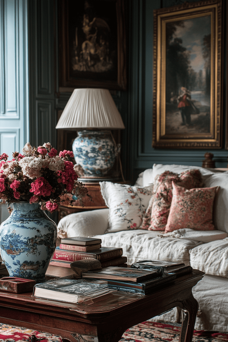 Timeless personality fills the room with coffee table decor ideas rooted in vintage inspiration. Antique-style accents, retro books, and sentimental objects add depth and story. Soft fabrics or velvet textures balance the aged details. Each piece feels curated rather than crowded. The result is elegant and nostalgic.