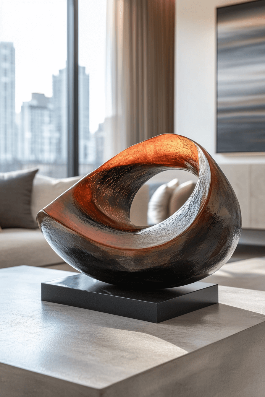 Bold confidence shines through coffee table decor ideas shaped by modern design. Sculptural objects, sleek materials, and clean lines create striking visual interest. Statement pieces take center stage while the layout remains minimal. The table feels polished and intentional. Style speaks without excess.
