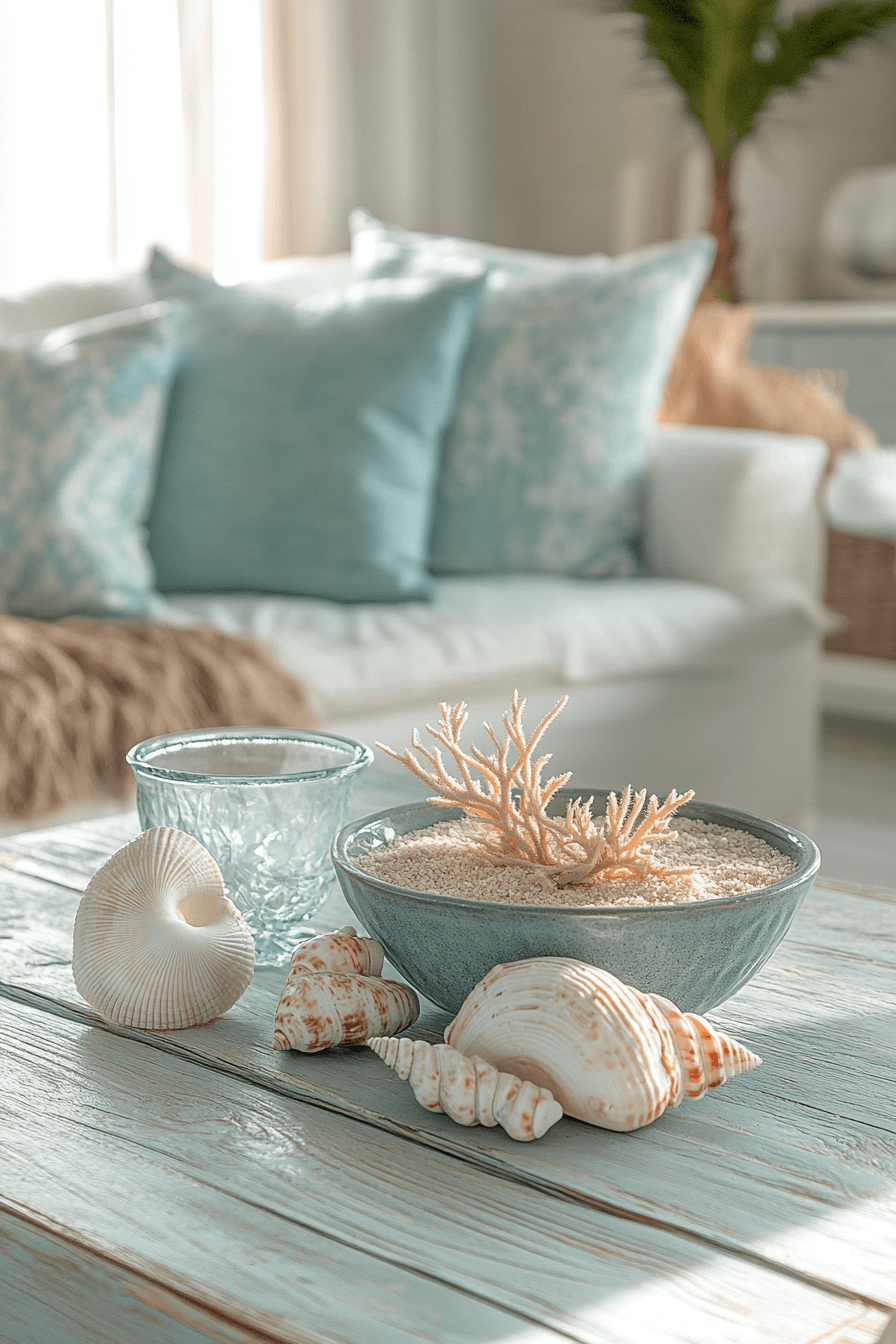 Relaxed coastal vibes flow effortlessly through coffee table decor ideas inspired by seaside living. Light woods, soft blues, and glass accents reflect natural light beautifully. Each element feels fresh and breezy. The space invites calm and comfort. The atmosphere feels like a quiet escape.