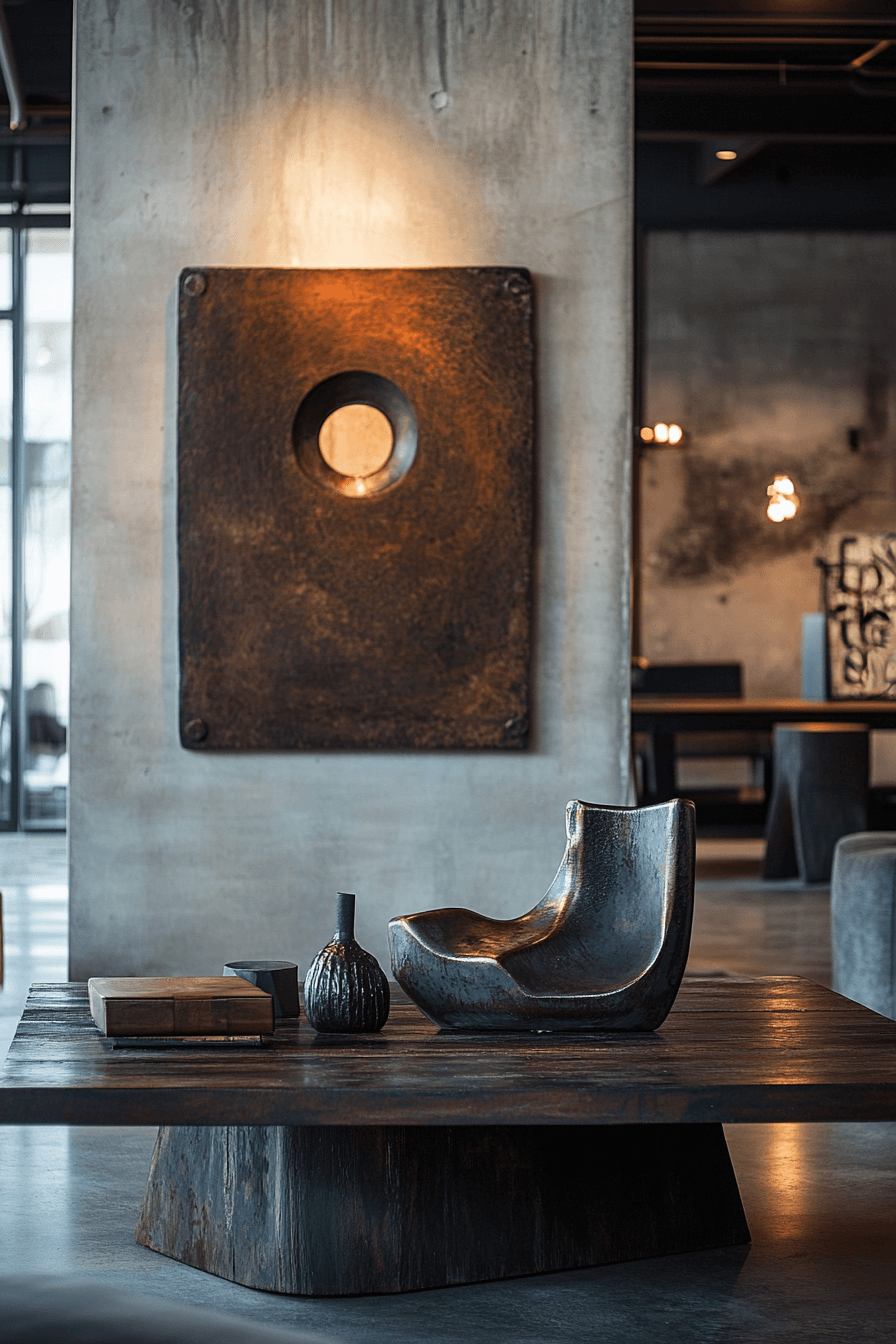 Strong materials and striking contrast define coffee table decor ideas with industrial influence. Metal finishes, concrete textures, and reclaimed wood add structure and depth. Dark tones ground the table visually. Softer accents keep the look balanced. The style feels bold yet refined.