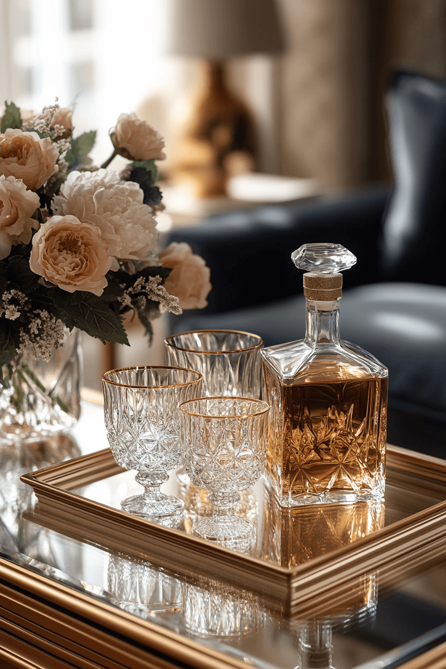 Shimmer and elegance define coffee table decor ideas designed to sparkle. Reflective surfaces, metallic finishes, and crystal accents catch the light effortlessly. Soft textures balance the shine for a refined look. The table becomes an eye-catching focal point. Glamour feels intentional, not overpowering.