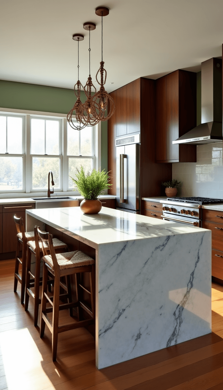 "Sunlit luxury kitchen with walnut cabinets, waterfall island in white quartz, sage green accent wall, bronze pendant lights, and stone backsplash"