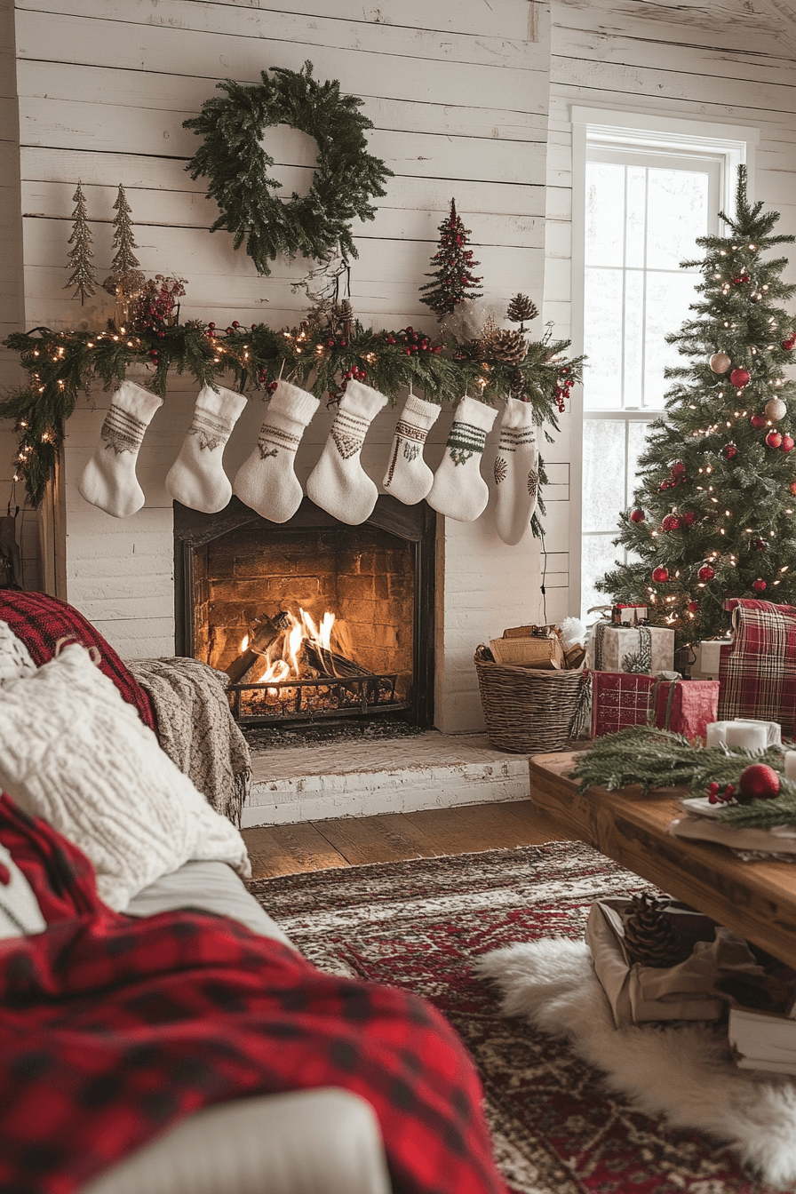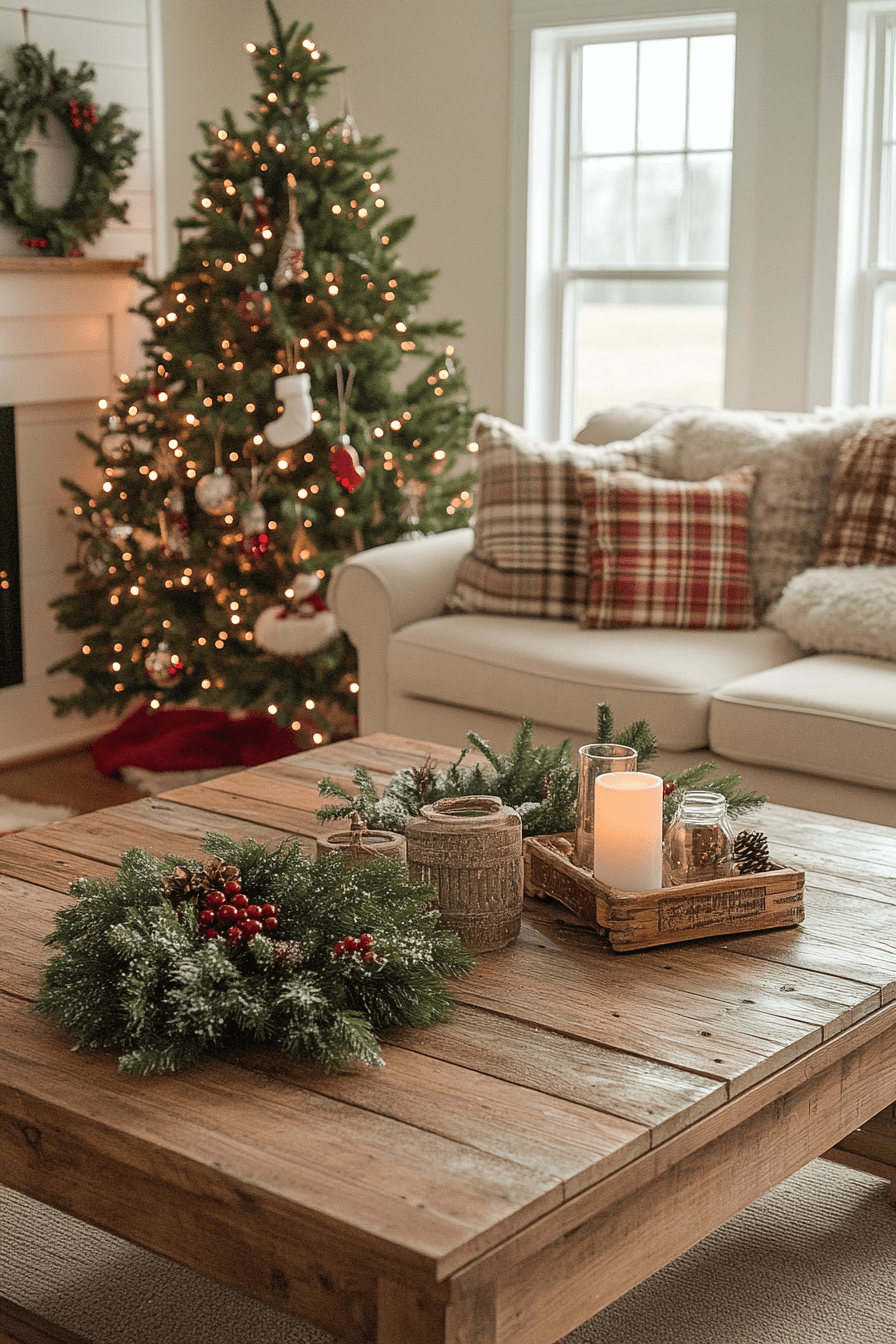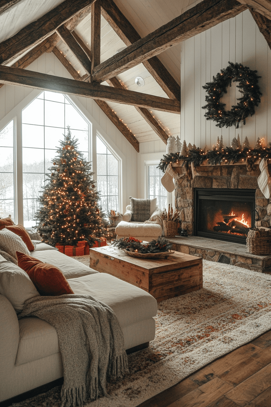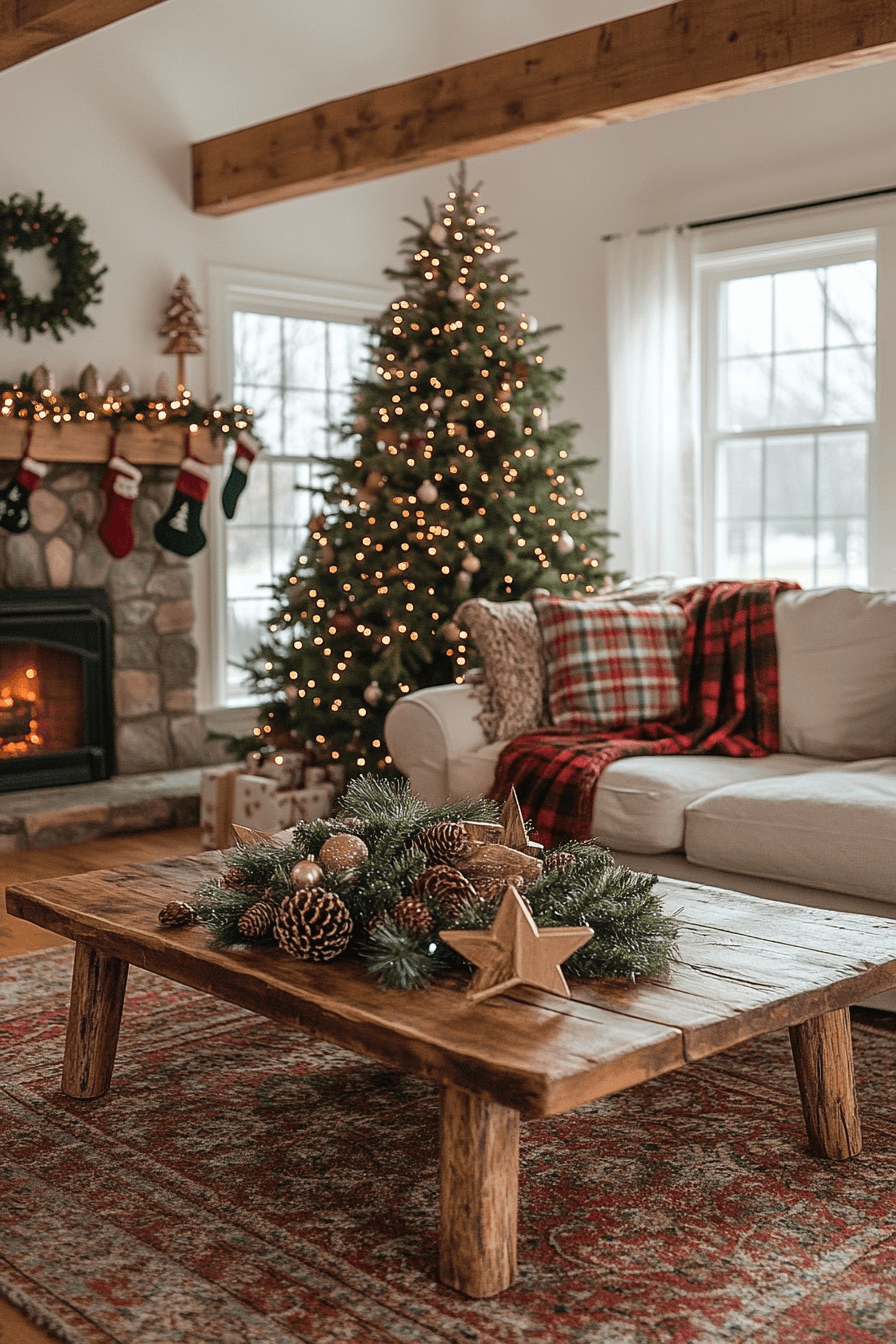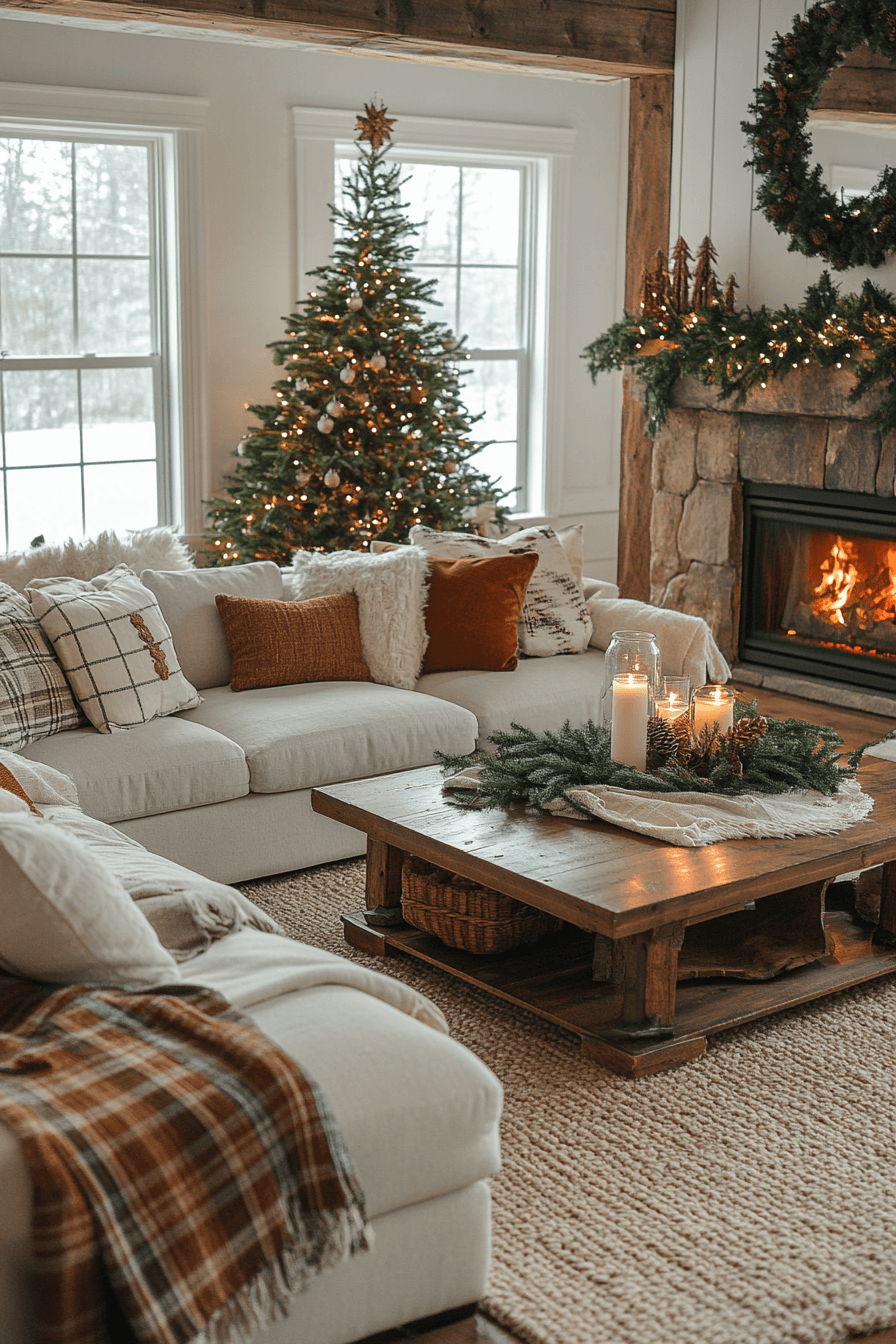 A mix of plaid, pine, and soft candlelight fills your living room with rustic warmth. Natural textures and flickering lights define the relaxed beauty of farmhouse Christmas decor. Every detail feels handmade, comforting, and timeless. The scent of greenery brings calm and nostalgia to the air.
