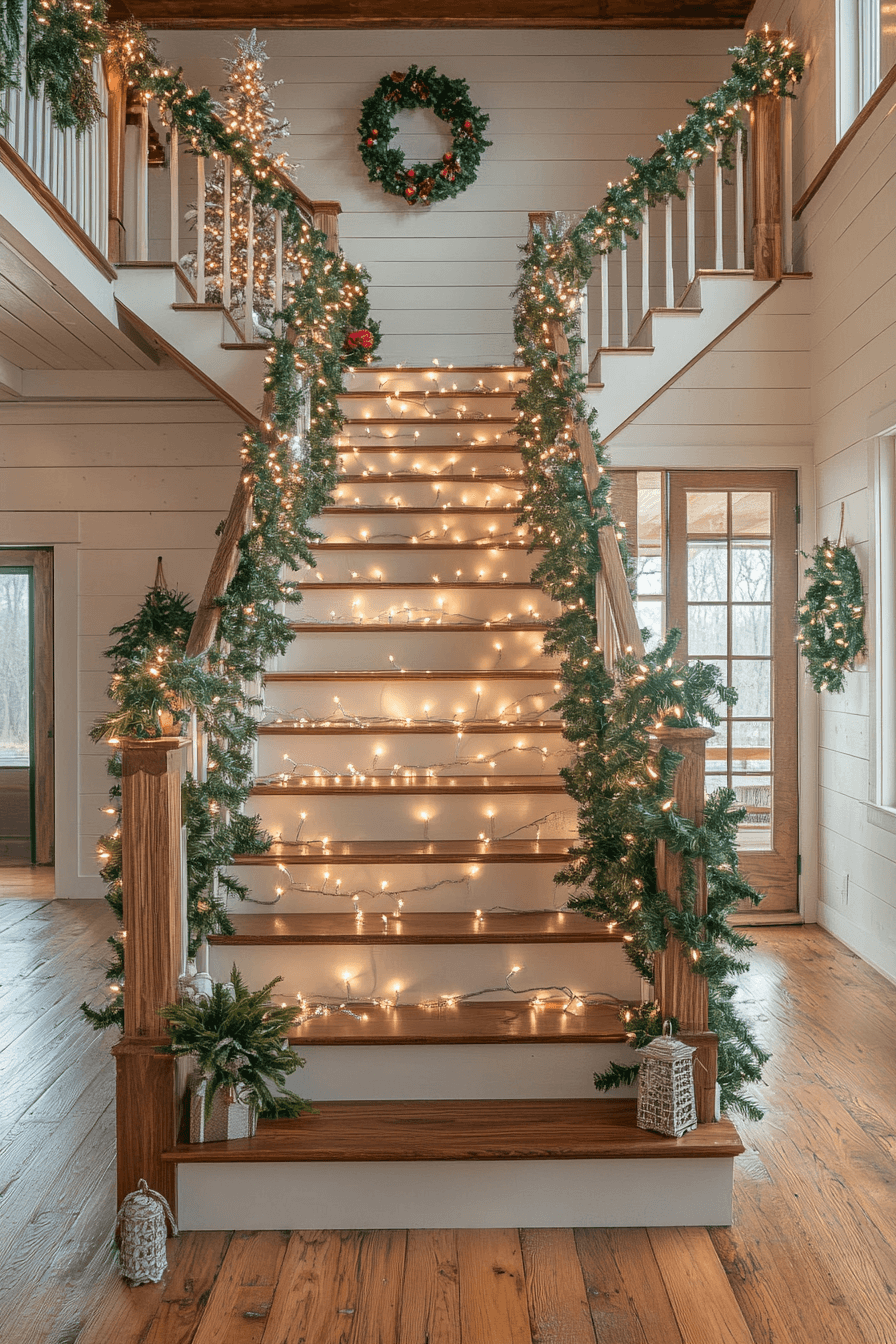 Garlands and soft ribbons wrap your staircase in natural beauty. The mix of wood and greenery brings a timeless rustic glow. Each twinkle of light celebrates farmhouse Christmas decor at its finest. The entire staircase becomes a festive centerpiece.
