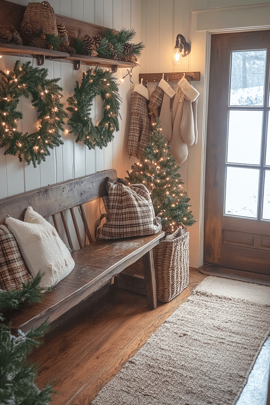 Soft garlands, wooden hooks, and warm tones make your mudroom feel merry and inviting. Simple textures and greenery bring out the relaxed side of farmhouse Christmas decor. Every element feels fresh and authentic. It’s festive, functional, and charmingly understated.