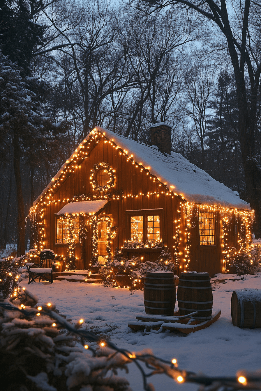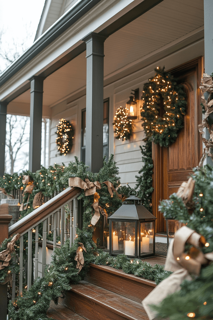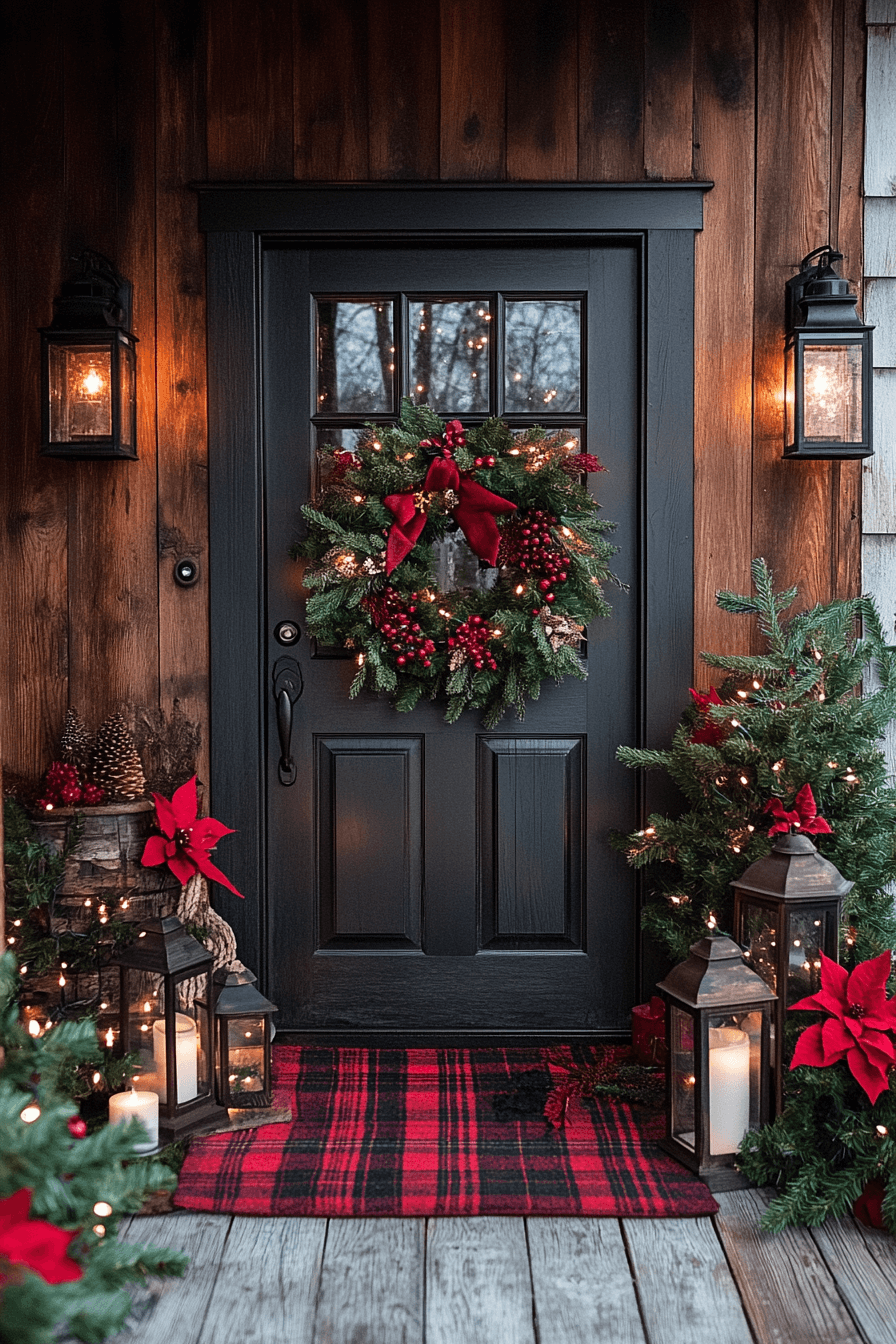 Your porch transforms into a magical retreat with twinkle lights and plaid ribbons. Garlands frame the doorway, and rustic accents tie the look together perfectly. The cozy glow brings the warmth of farmhouse Christmas decor outside. Every flicker feels like a gentle invitation.