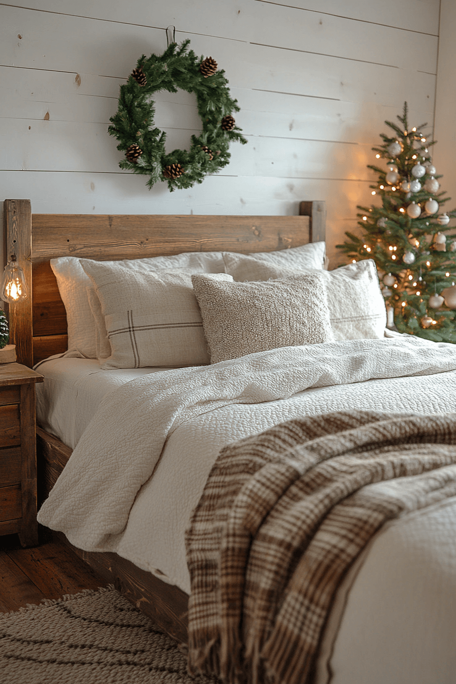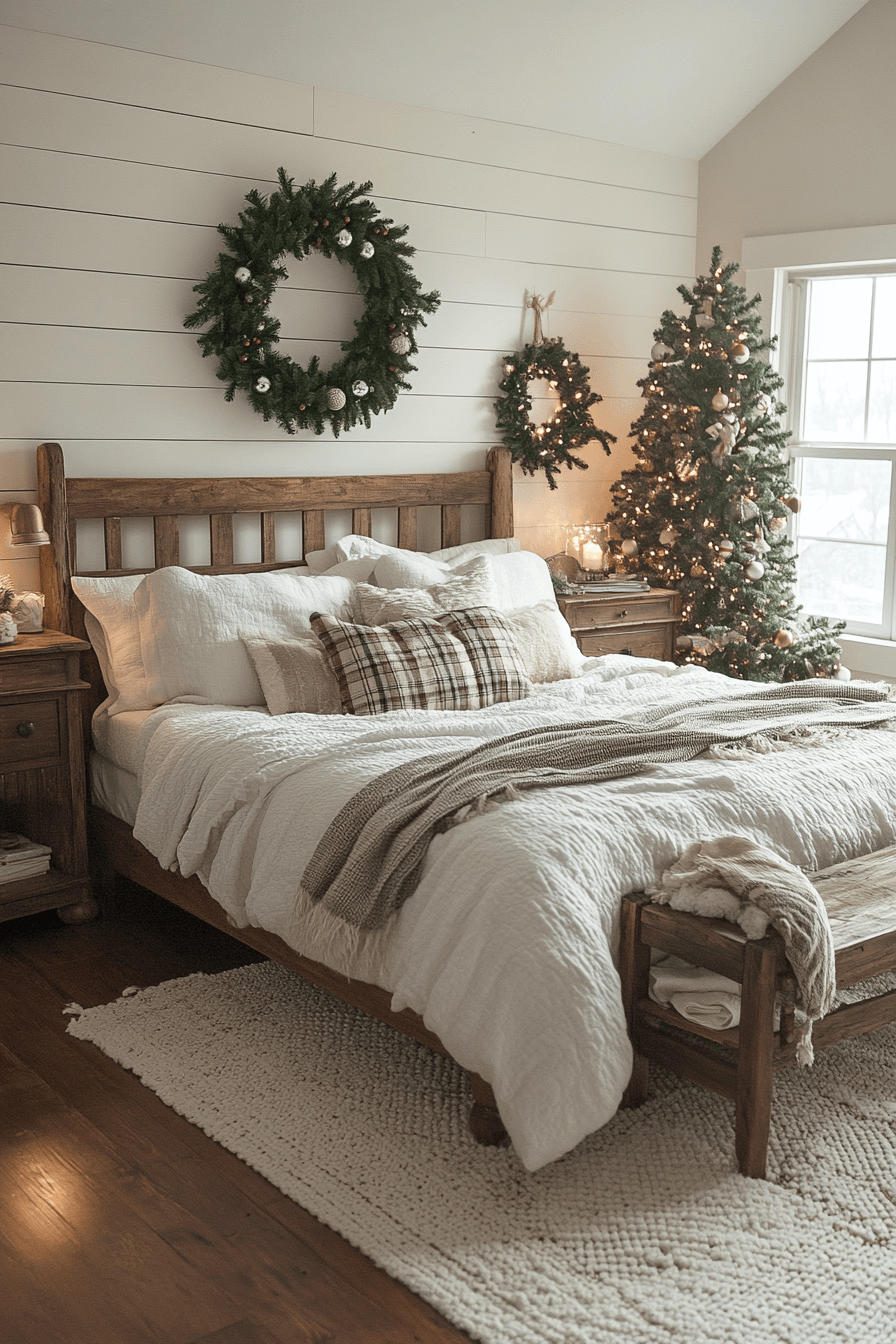 Layer soft blankets, glowing garlands, and wooden details for a bedroom that feels like a winter escape. The neutral palette and warm tones create peaceful serenity. Every accent reflects the simple charm of farmhouse Christmas decor. It’s calm, inviting, and naturally beautiful.