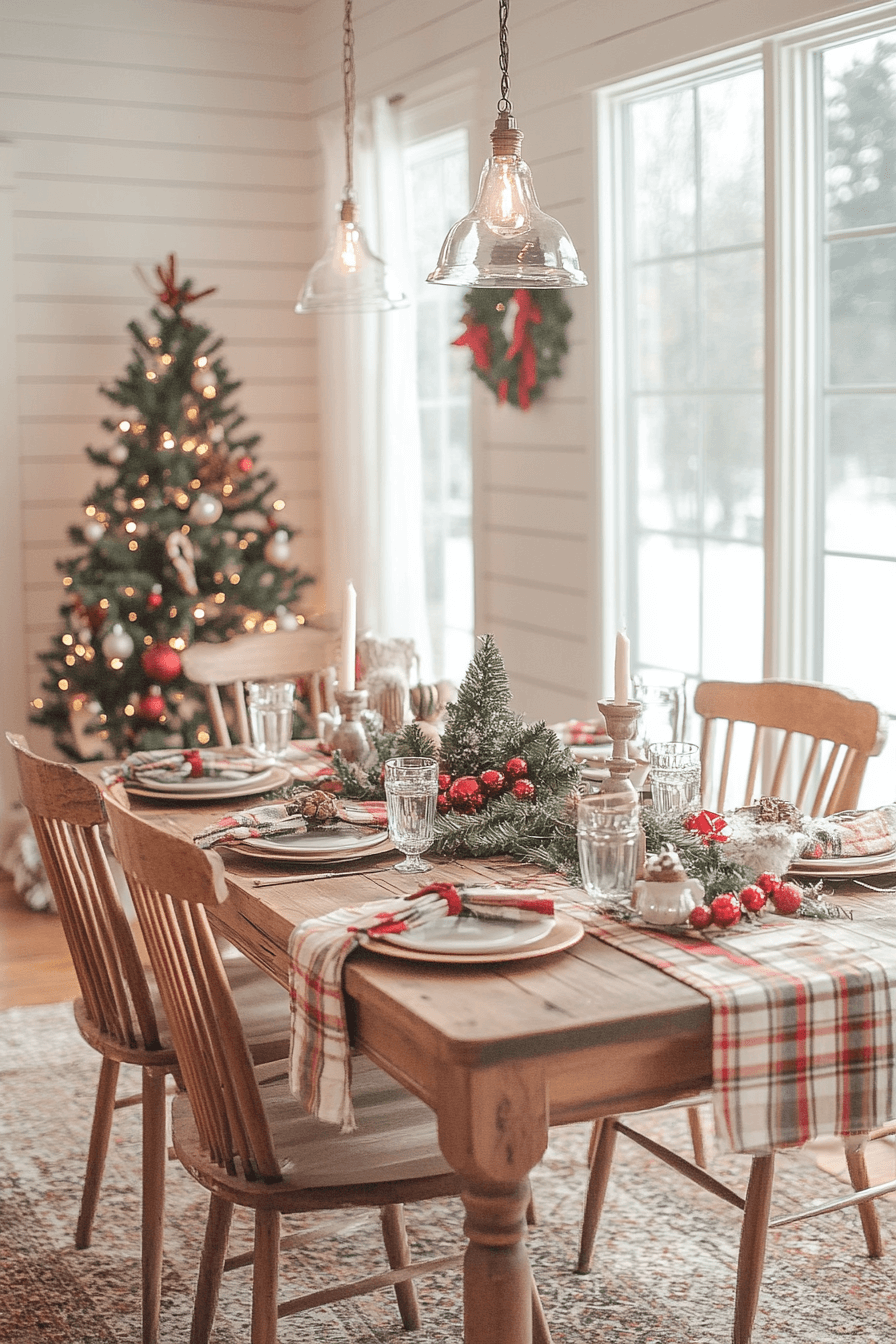 Start mornings in a breakfast nook glowing with rustic beauty. Candles, plaid cushions, and a mini tree define farmhouse Christmas decor simplicity. The space feels warm, bright, and charming. Each detail makes breakfast moments more special.