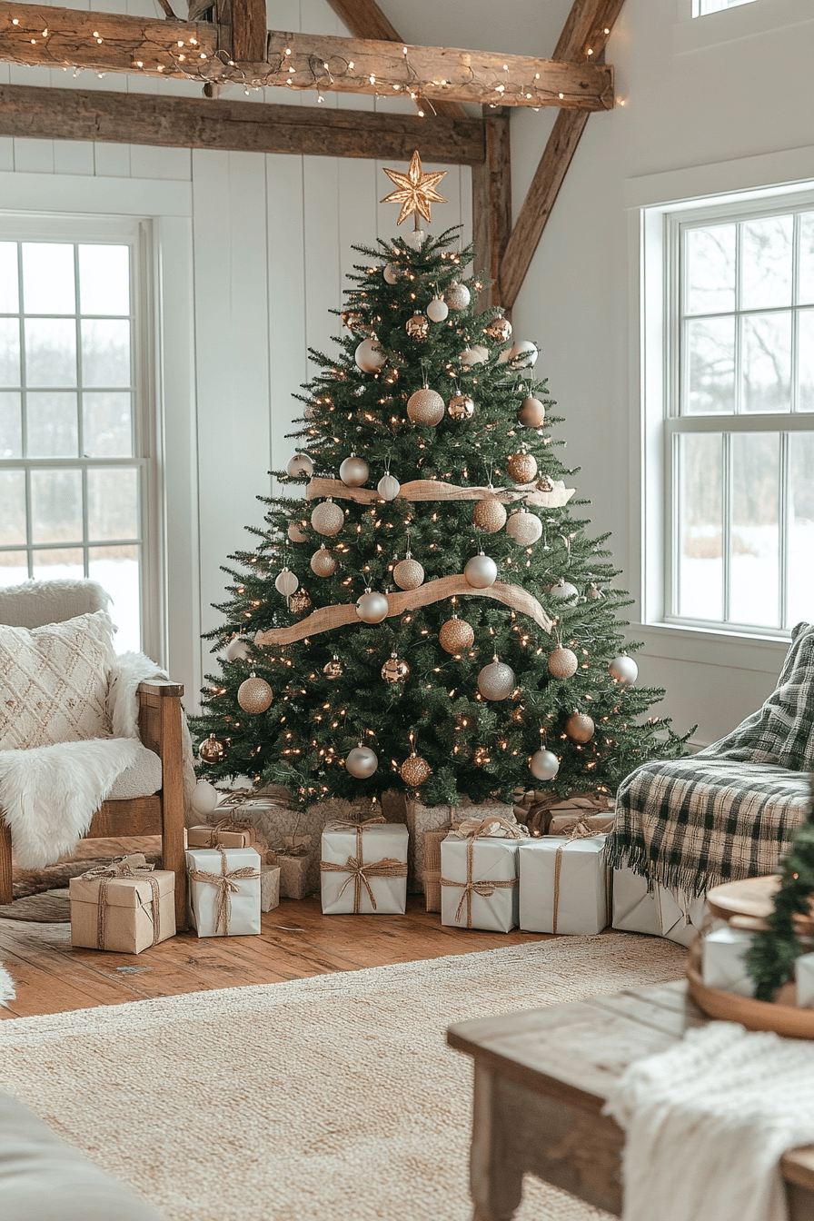 Decorate your tree with burlap ribbon, wooden ornaments, and soft white lights for a timeless effect. Each handmade detail captures the essence of farmhouse Christmas decor. The gentle glow feels nostalgic and magical. It’s traditional with a touch of simplicity.