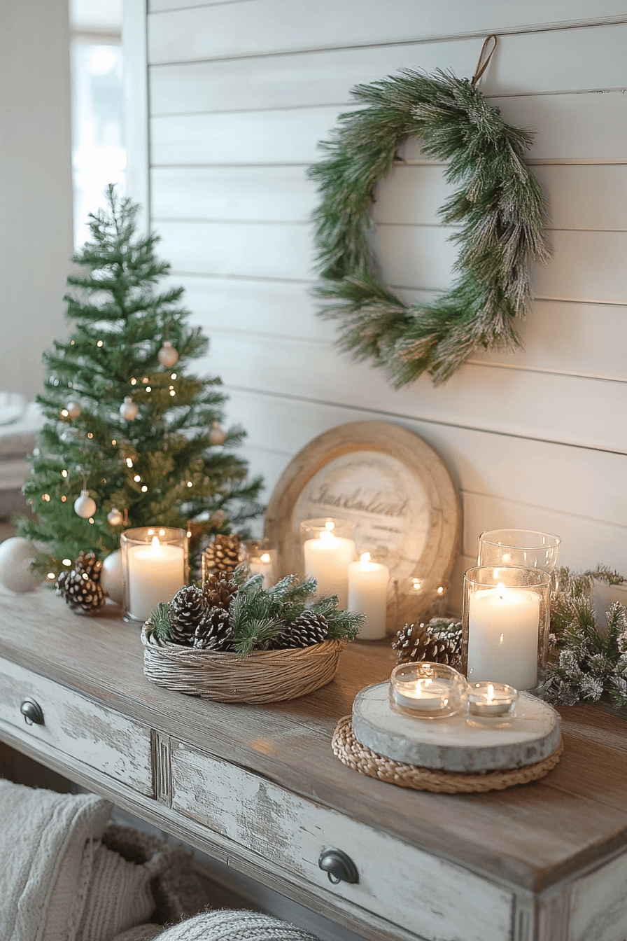 Candles, pine branches, and wood accents bring your console table to life. The natural textures and glowing light define farmhouse Christmas decor perfection. It’s small, stylish, and heartwarming. Each accent ties your rooms together beautifully.