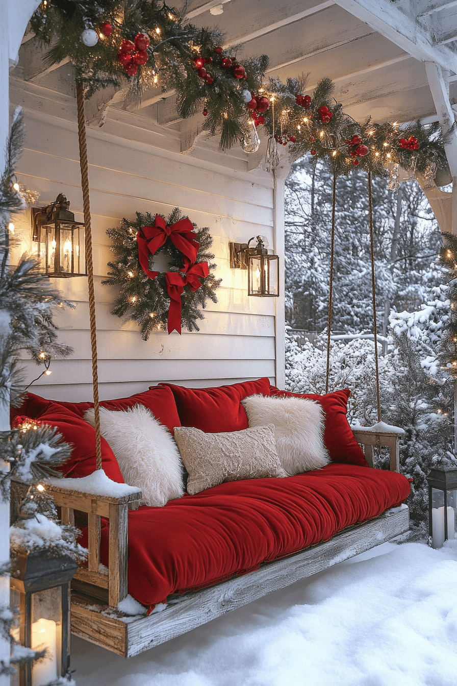 Plaid blankets, fairy lights, and greenery transform your porch swing into a cozy winter corner. The atmosphere glows with farmhouse Christmas decor charm. Every cushion invites you to sit, sip, and relax. It’s comfort at its purest.
