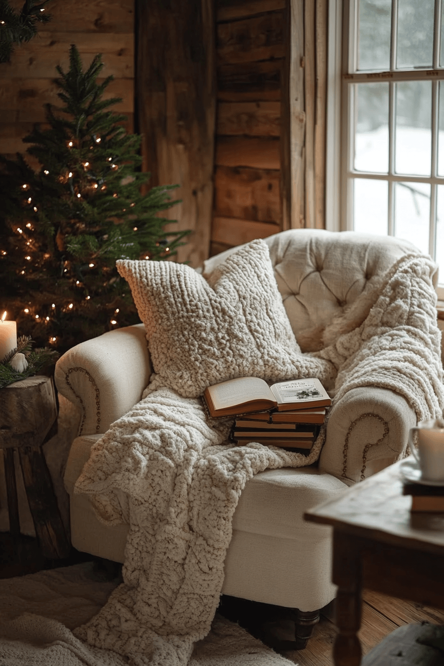 Add warmth to your reading nook with twinkle lights, soft throws, and a touch of greenery. The mix of comfort and simplicity embodies farmhouse Christmas decor charm. It’s calm, inspiring, and beautifully cozy. Perfect for unwinding on chilly nights.