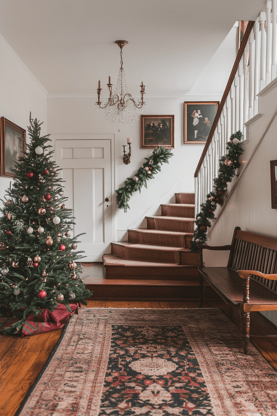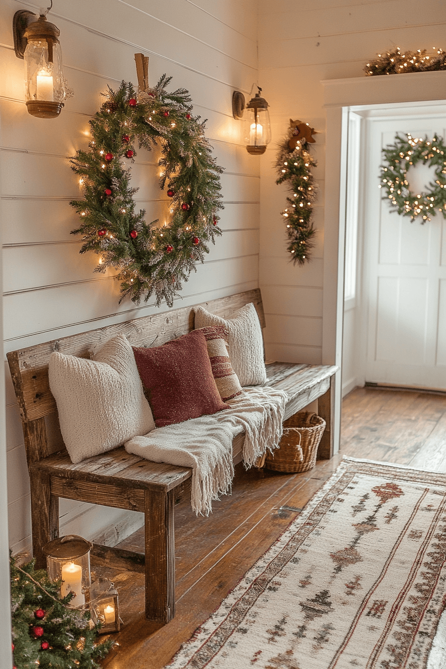 Twinkling lights and natural tones transform your hallway into a scene of country elegance. Green garlands and candles add depth and movement to the space. Every corner glows with farmhouse Christmas decor charm. It’s peaceful, pretty, and full of warmth.