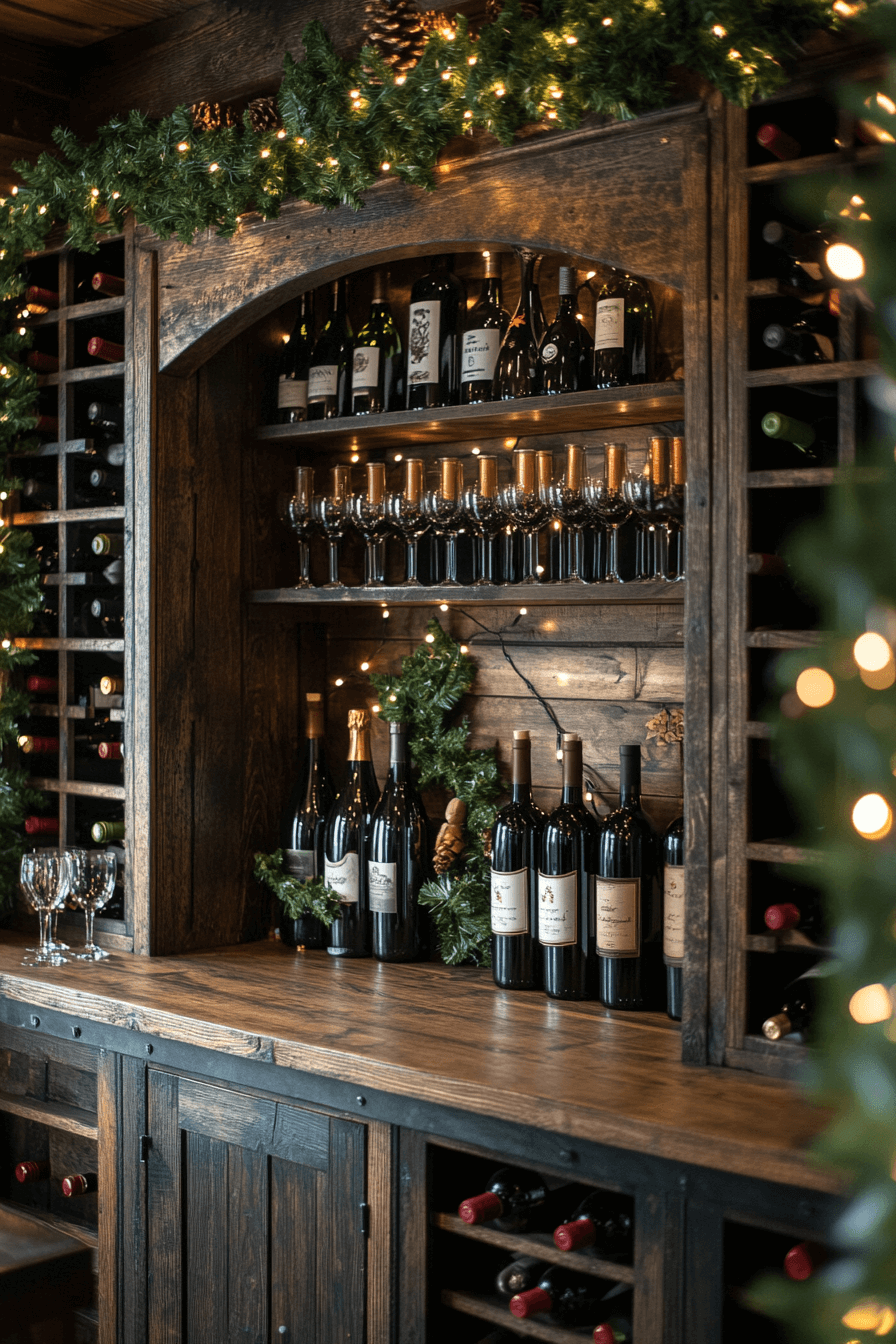 Soft lighting and greenery bring your wine room to life with festive charm. The natural materials express the rustic appeal of farmhouse Christmas decor. It’s refined yet down-to-earth. Each detail makes the space feel intimate and relaxed.