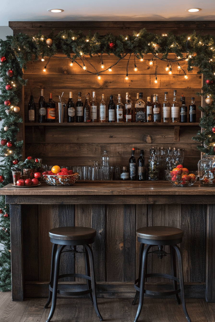 Garlands, string lights, and rustic barware make your wet bar glow with holiday energy. The warmth of wood and light highlight farmhouse Christmas decor at its finest. It’s charming, lively, and irresistibly welcoming. Each sparkle sets a celebratory mood.