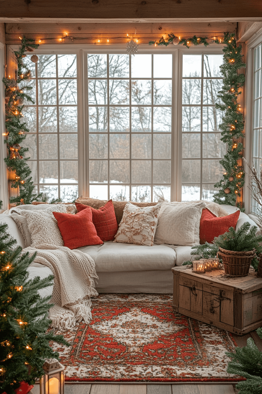Let sunlight and evergreens fill your sunroom with peaceful holiday joy. The mix of natural light and wood evokes farmhouse Christmas decor serenity. It’s bright, airy, and timelessly beautiful. Every moment feels soft and inviting.
