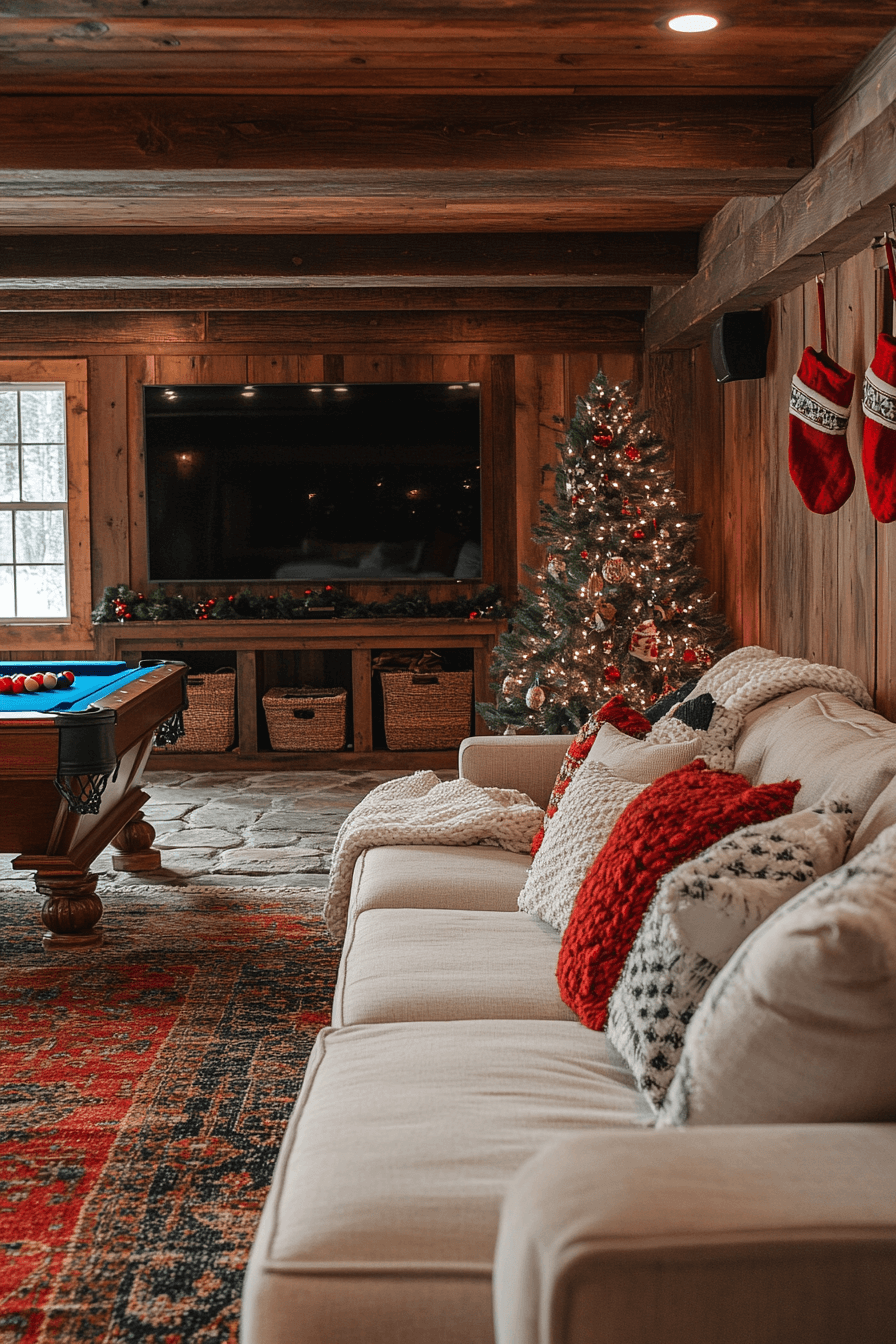 The basement becomes a cozy retreat with garlands, blankets, and twinkle lights. Natural wood tones and glowing candles show off farmhouse Christmas decor charm. The vibe is relaxed and full of heart. It’s the perfect space for family gatherings or quiet nights.