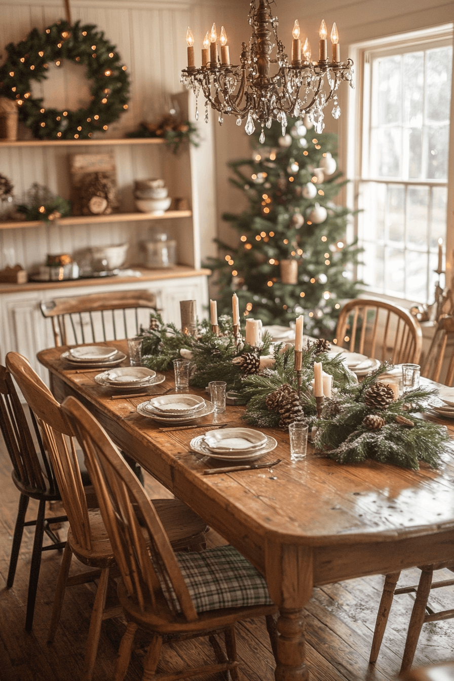 Gather around a wooden table dressed with garlands and glowing candles for a festive feast. The combination of natural materials and gentle lighting captures the heart of farmhouse Christmas decor. Every dish and centerpiece adds to the rustic charm. The look is welcoming, relaxed, and full of heart.