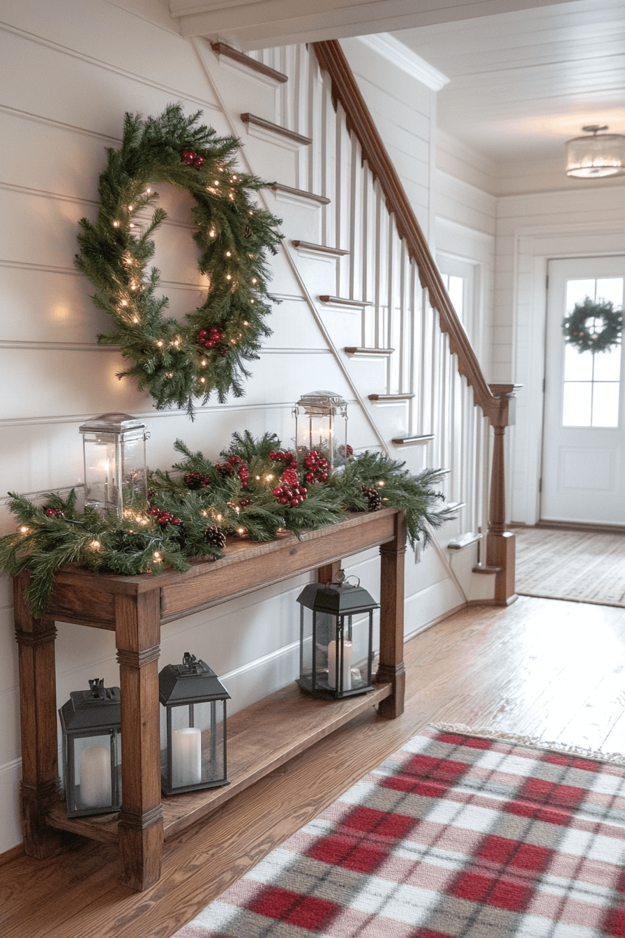 Greet your guests with a hallway glowing in warm light and greenery. Lanterns, garlands, and wreaths create a cozy first impression. Each detail reflects the peaceful essence of farmhouse Christmas decor. The space feels both refined and homey.
