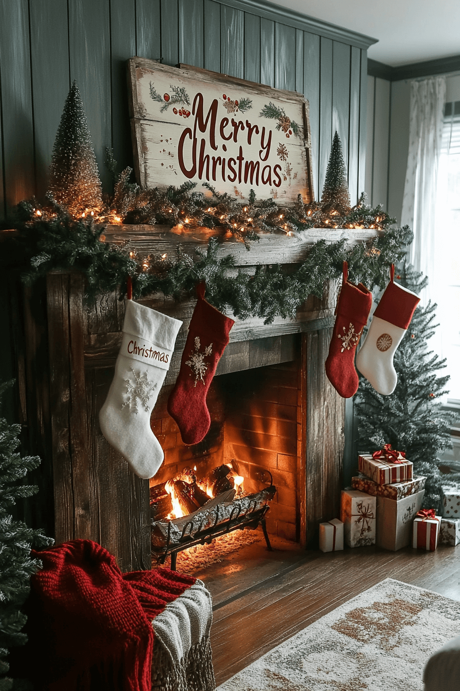Layer greenery, candles, and stockings across your fireplace for the perfect holiday scene. The soft light reflects beautifully off natural textures. Every glow embodies the warmth of farmhouse Christmas decor. It’s rustic, simple, and utterly heartwarming.