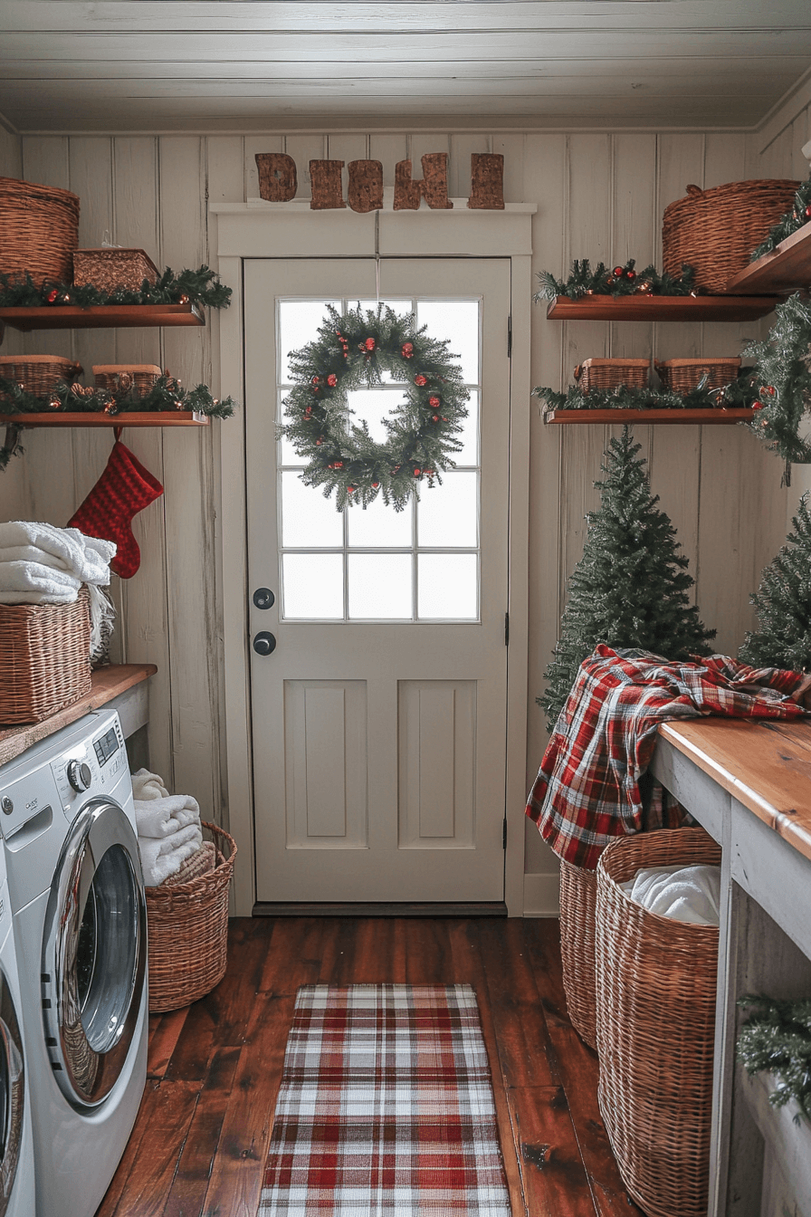 Even your laundry room can share in the joy of the season. Add a small wreath, wood baskets, and soft light for effortless charm. These subtle touches highlight the simplicity of farmhouse Christmas decor. It’s cheerful, cozy, and practical at once.