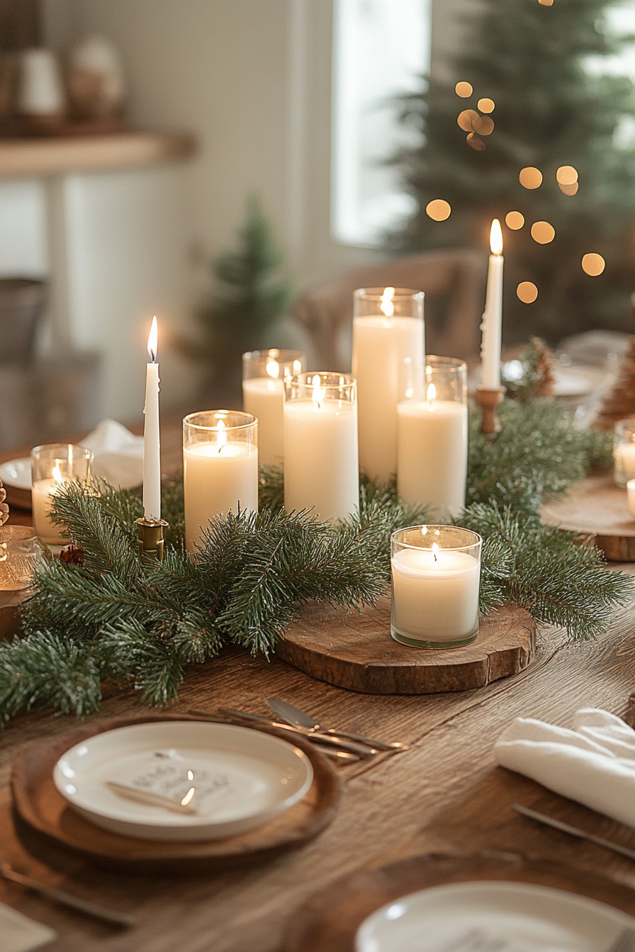 Layer candles, trays, and greenery for a buffet table that shines with charm. The soft glow enhances the authenticity of farmhouse Christmas decor. Every texture adds richness and warmth. It’s elegant in the simplest way.