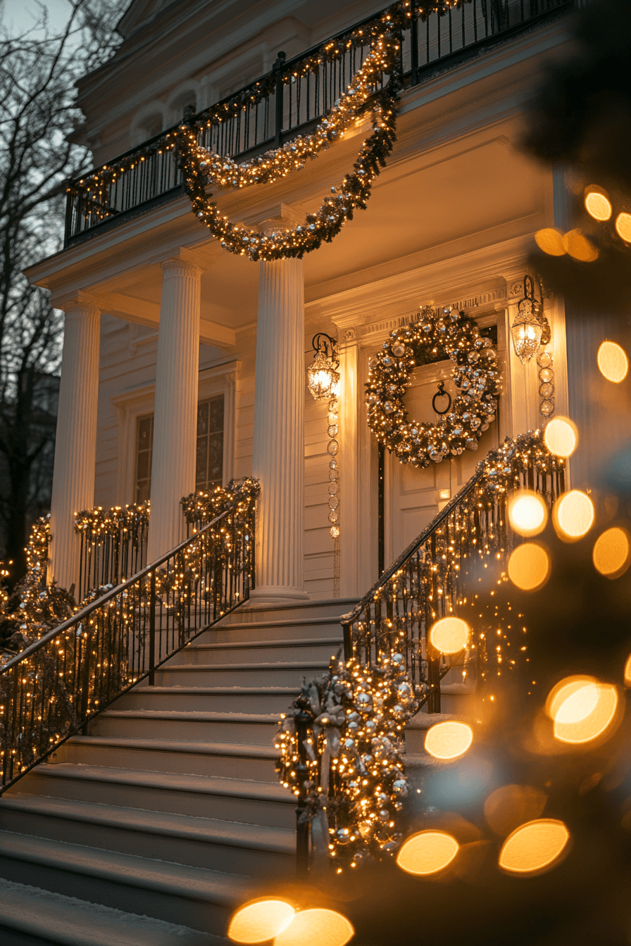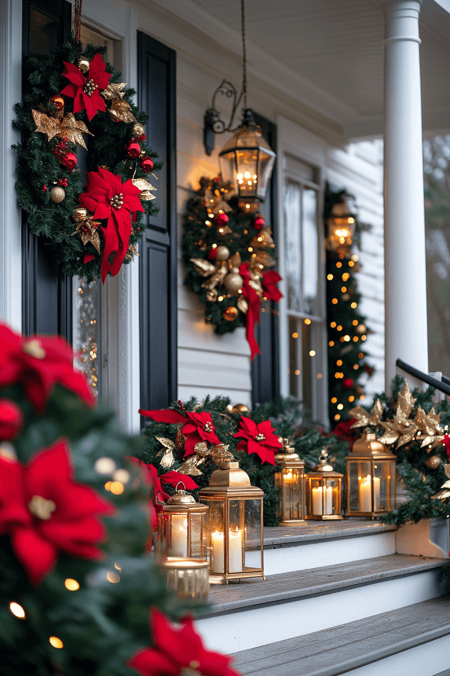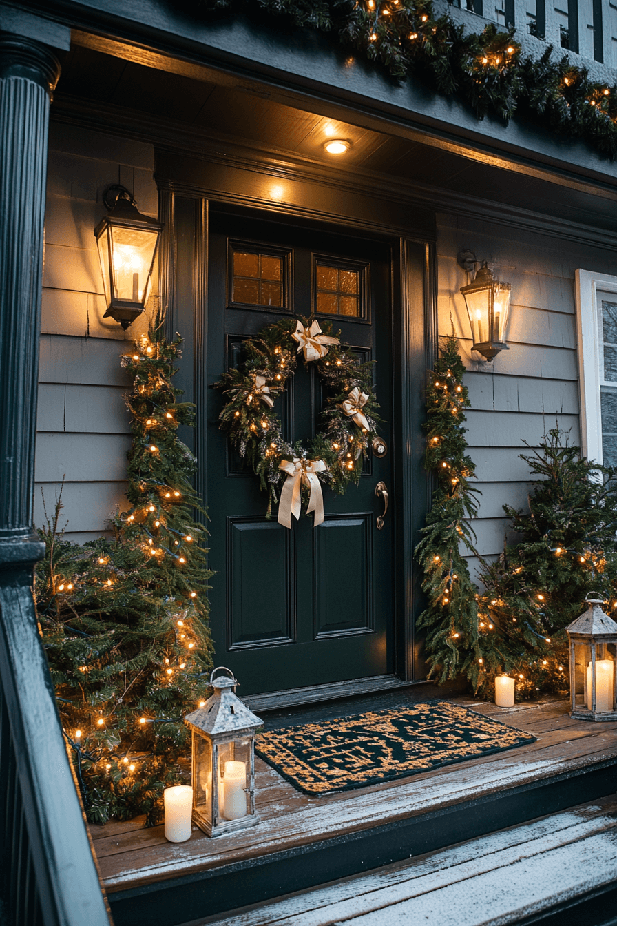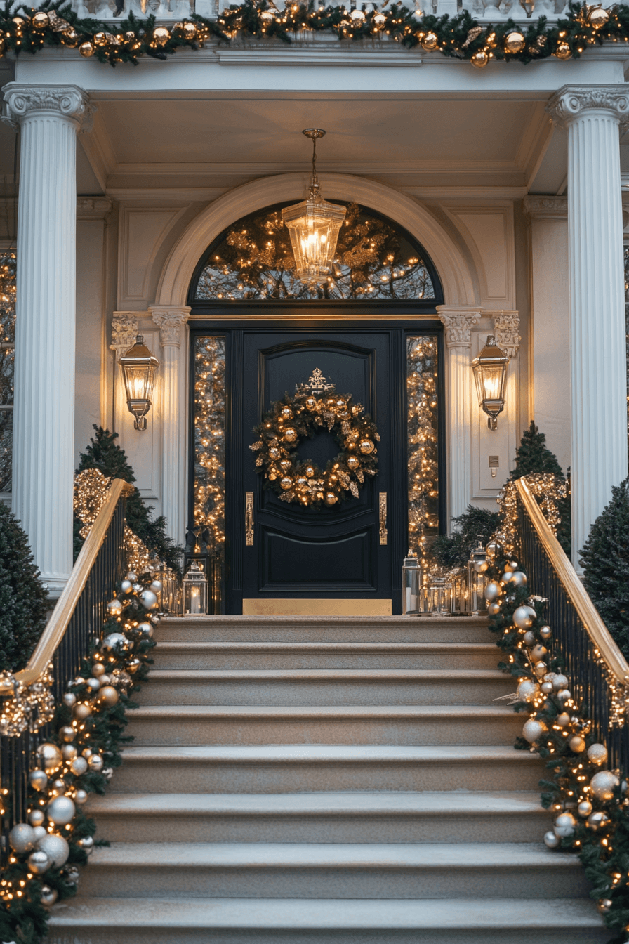 Infuse timeless elegance into your home with front porch christmas decor built around gilded lanterns and muted metallics. Gold-trimmed garlands climb the railings while satin ribbons flutter softly in the breeze. Each light reflects a warm, champagne hue that feels sophisticated yet inviting. Add a single statement wreath to complete the look.