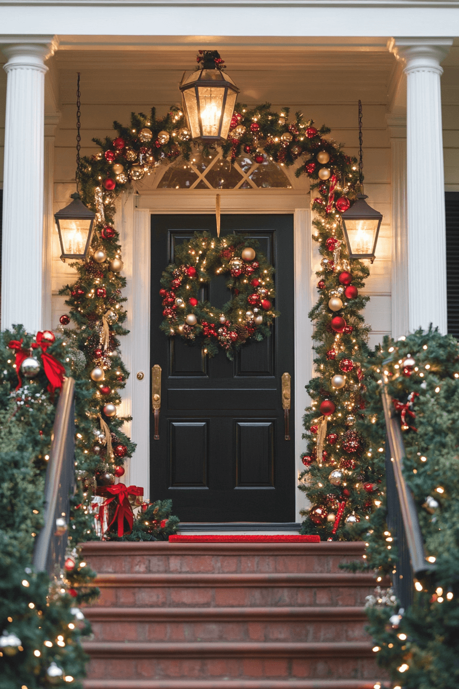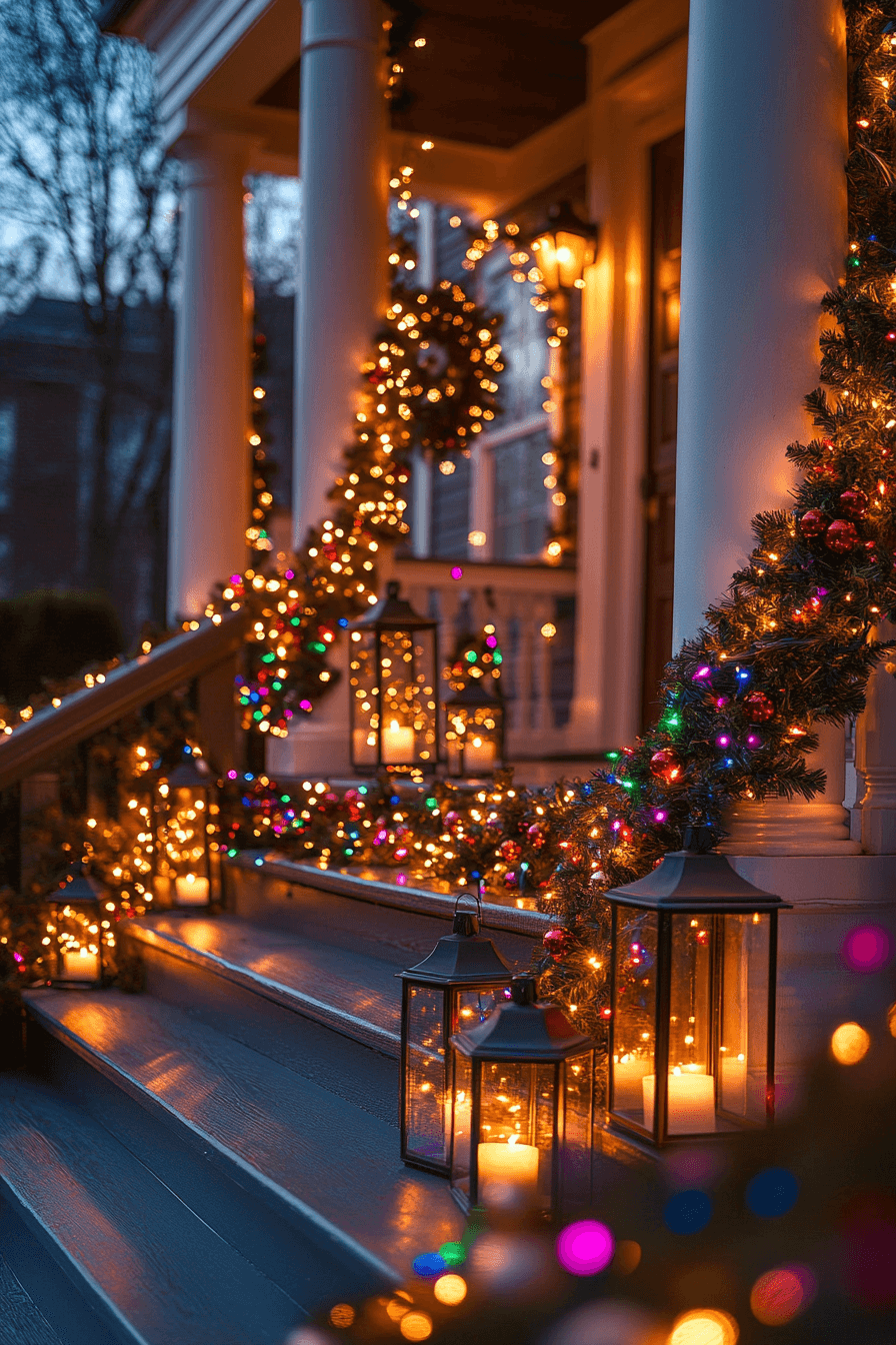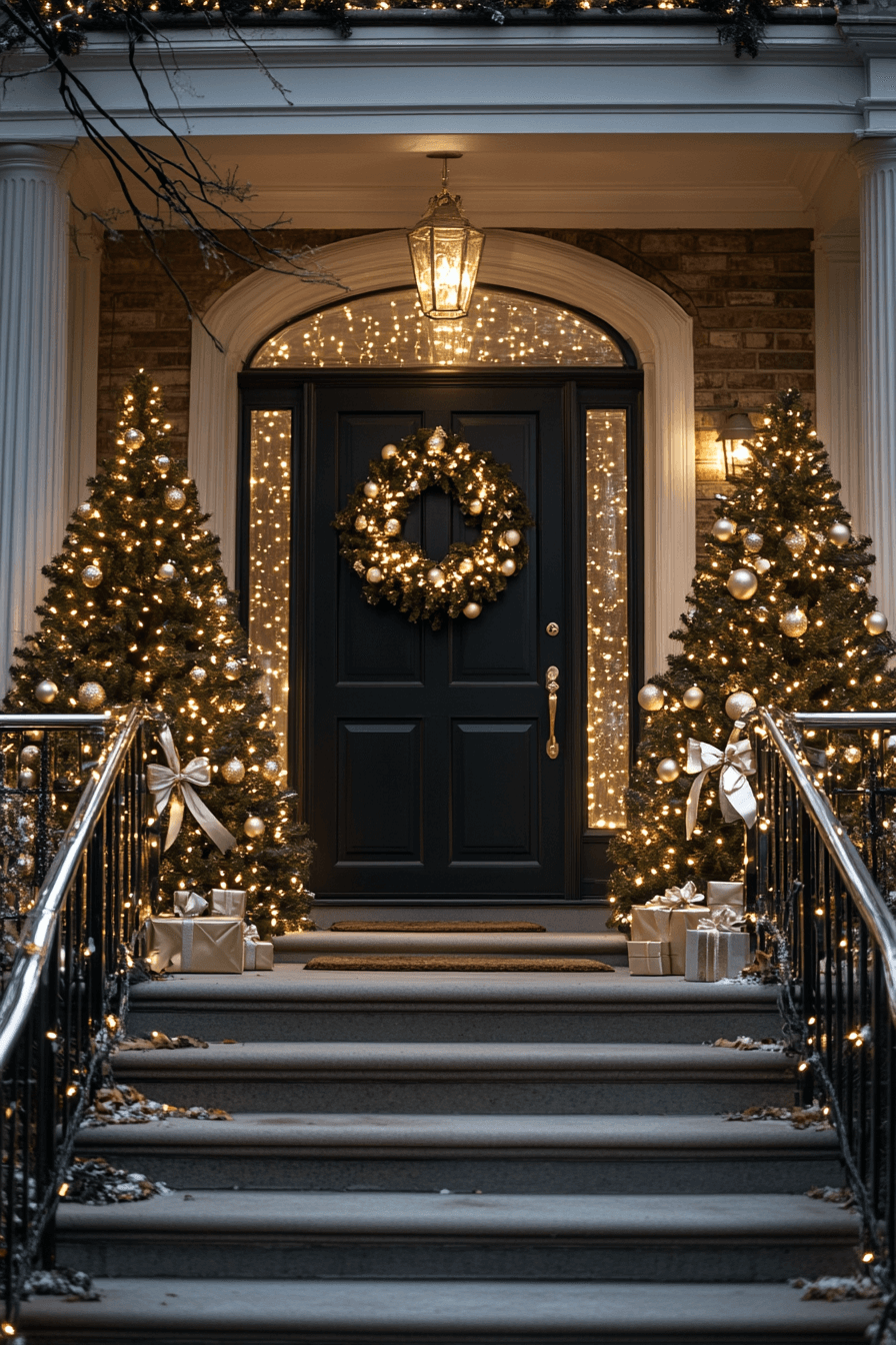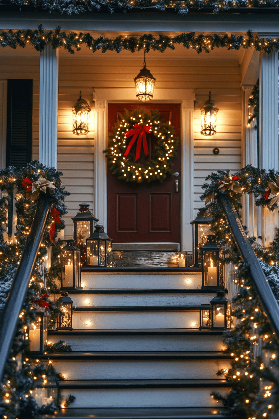 Infuse timeless elegance into your home with front porch christmas decor built around gilded lanterns and muted metallics. Gold-trimmed garlands climb the railings while satin ribbons flutter softly in the breeze. Each light reflects a warm, champagne hue that feels sophisticated yet inviting. Add a single statement wreath to complete the look.