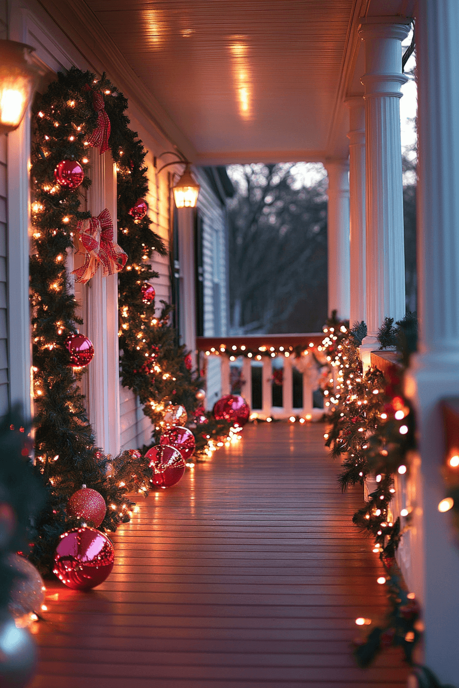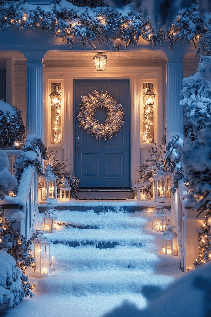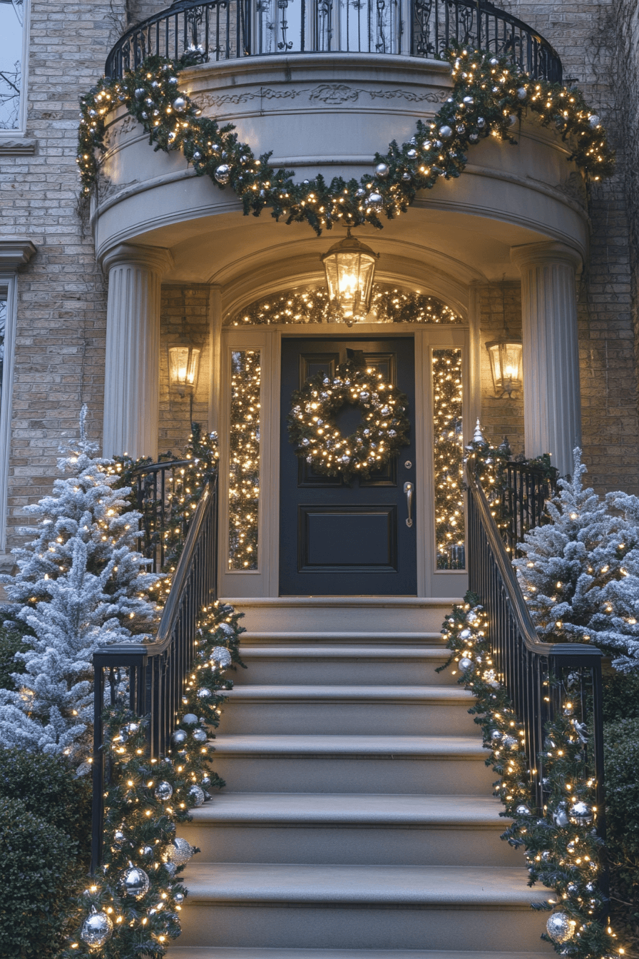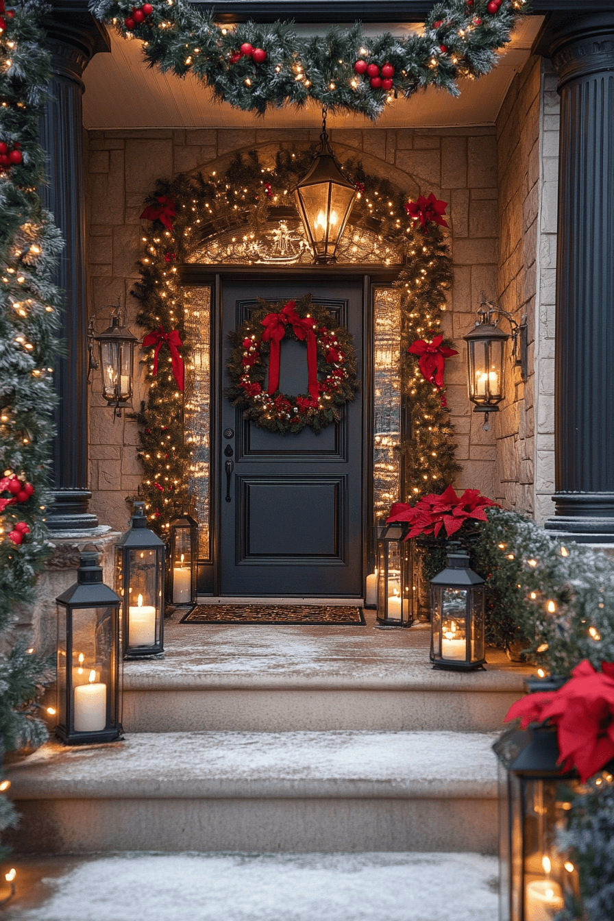 Infuse timeless elegance into your home with front porch christmas decor built around gilded lanterns and muted metallics. Gold-trimmed garlands climb the railings while satin ribbons flutter softly in the breeze. Each light reflects a warm, champagne hue that feels sophisticated yet inviting. Add a single statement wreath to complete the look.