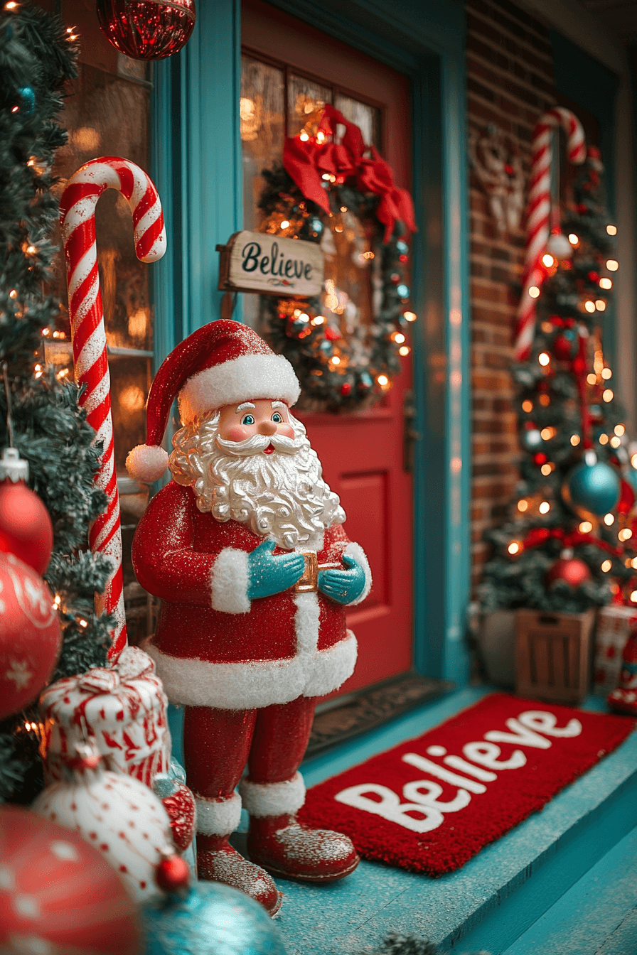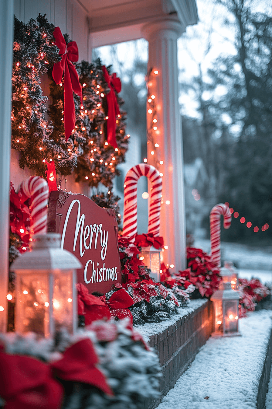 Make guests smile with front porch christmas decor brimming with peppermint whimsy. Candy-striped bows, red-and-white lanterns, and playful signage create a scene straight from a bakery window. Add a mug of cocoa on a side table for charm. The look is sweet, joyful, and full of energy.