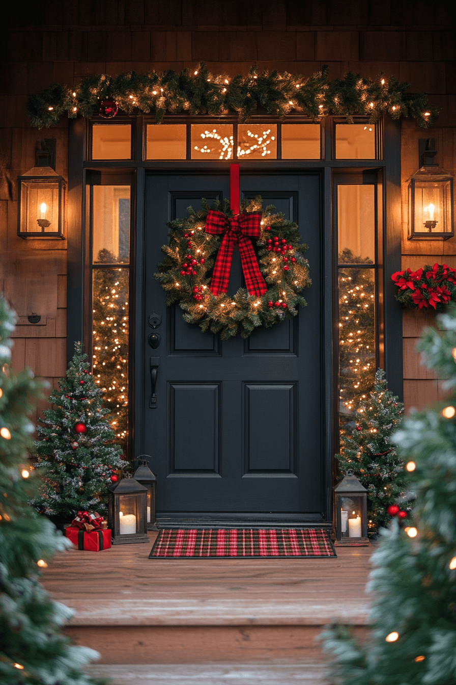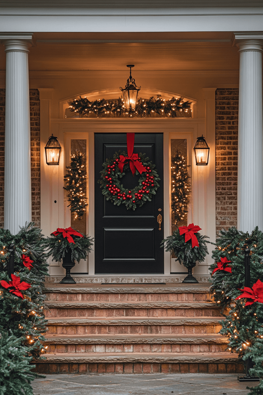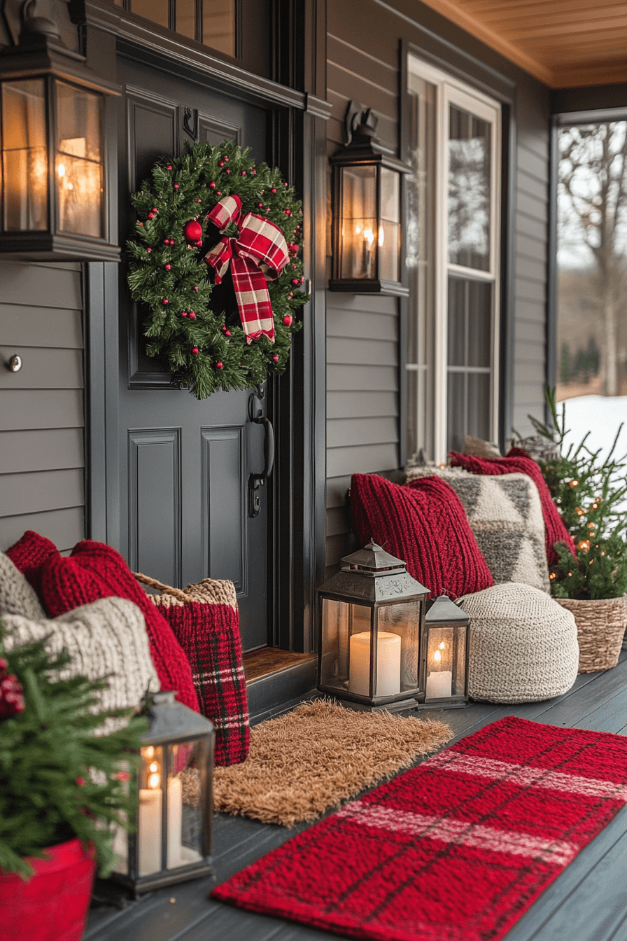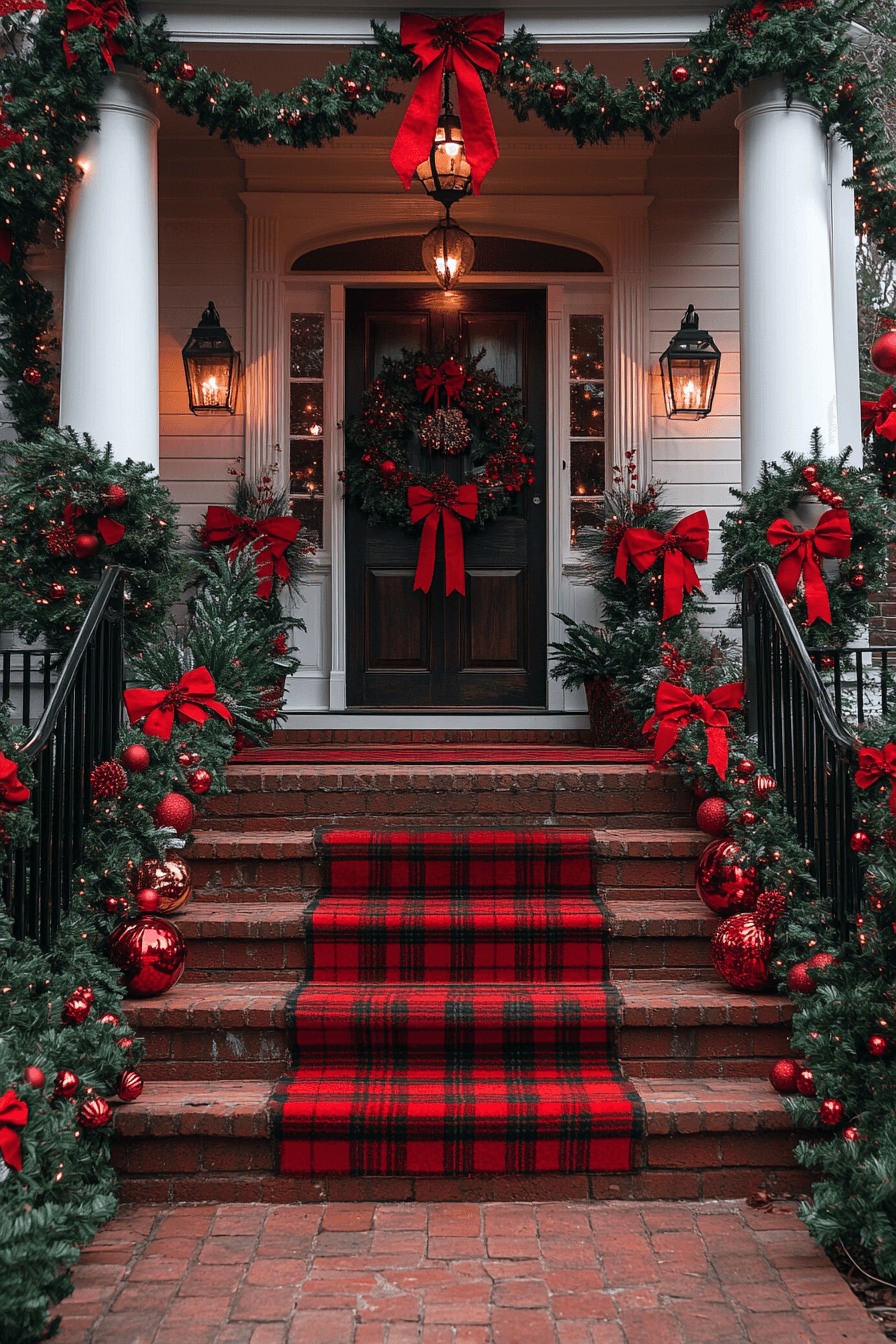 Celebrate heritage charm through front porch christmas decor in deep crimson and forest green. Lush garlands frame the door while plaid ribbons tie it all together. Lanterns flicker softly beside potted evergreens, echoing nostalgic warmth. The look feels grounded, traditional, and full of spirit.