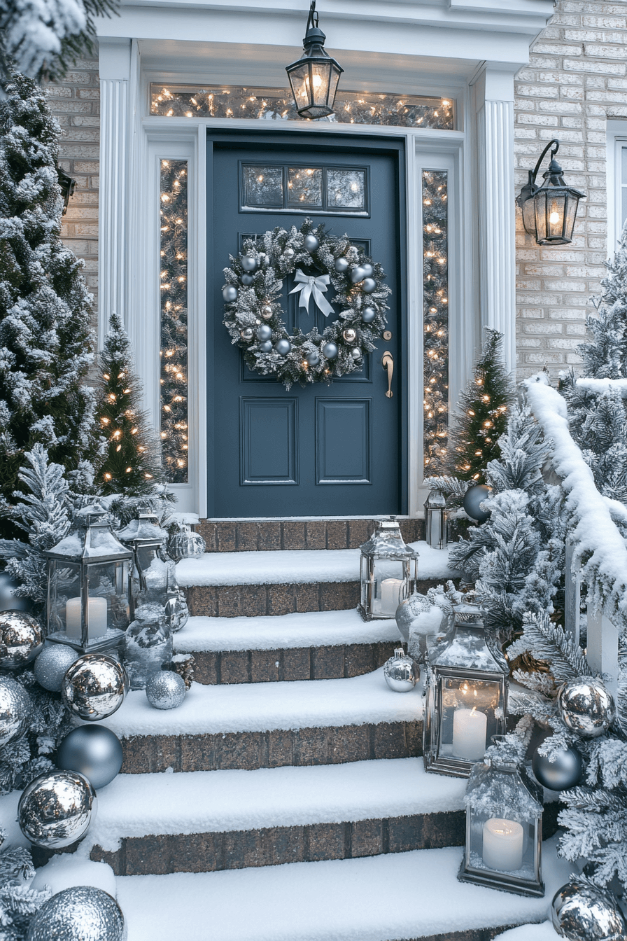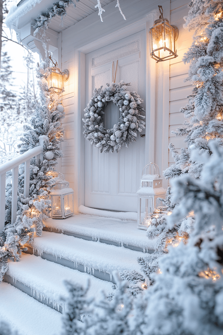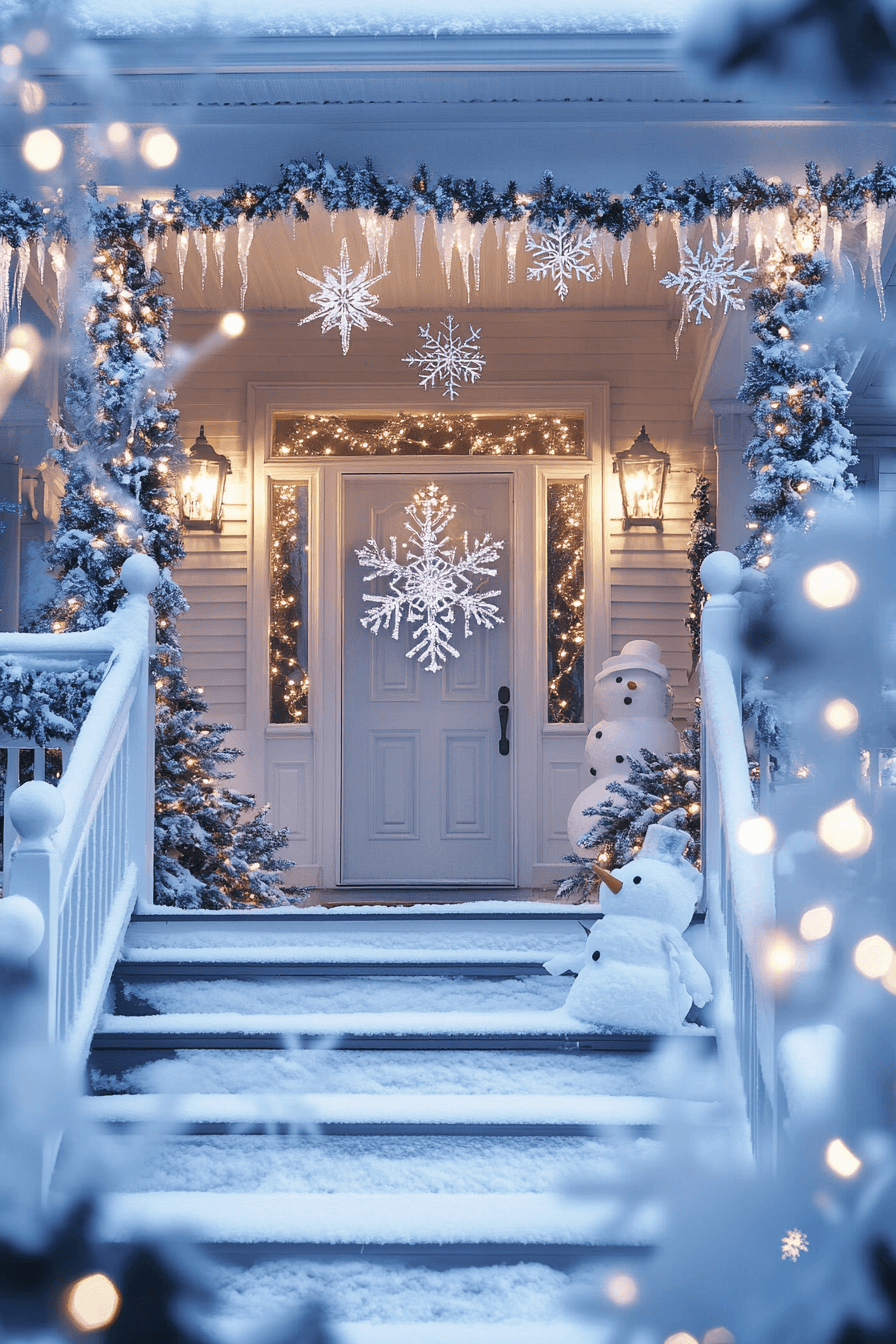 Embrace icy beauty with front porch christmas decor built around frosted ornaments and glimmering crystal lights. Snowflake garlands hang like jewelry, catching every sparkle from above. The palette of white and pale silver feels pure and calm. Add mirrored lanterns for extra shine.