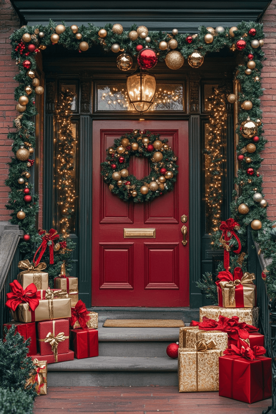 Let your doorway dazzle after dark with front porch christmas decor featuring starlit gold accents. Metallic ribbons twist through evergreens while soft lights scatter like constellations. The harmony of gold and greenery feels celestial. Add a mirrored ornament cluster for depth.